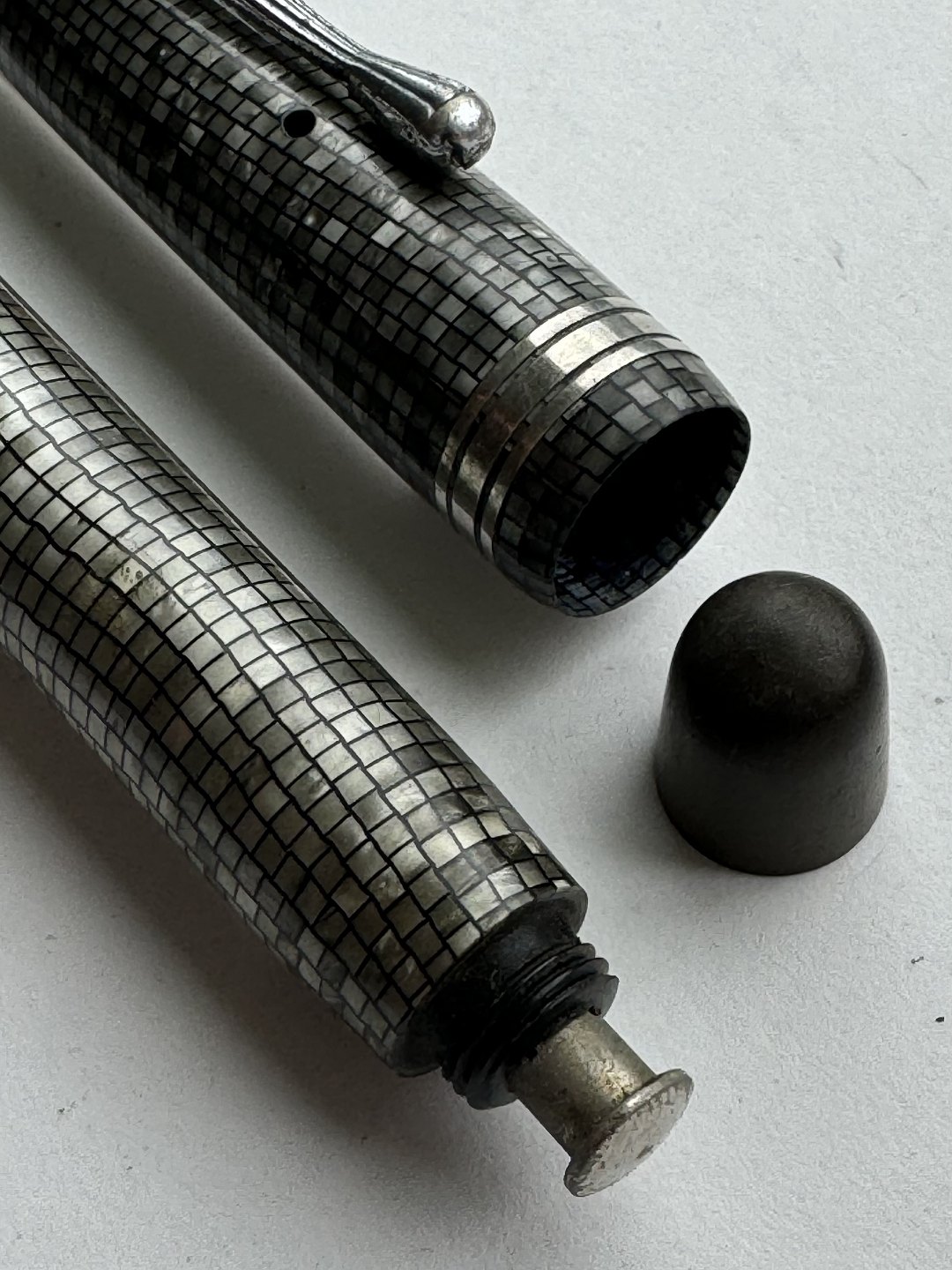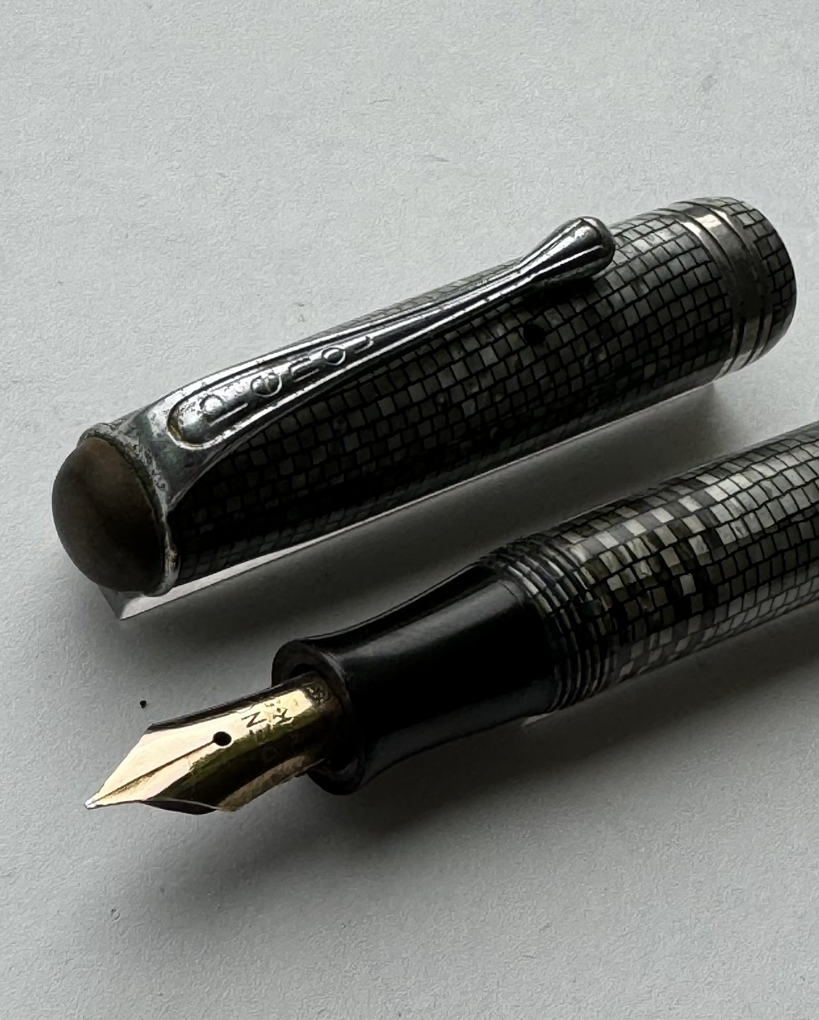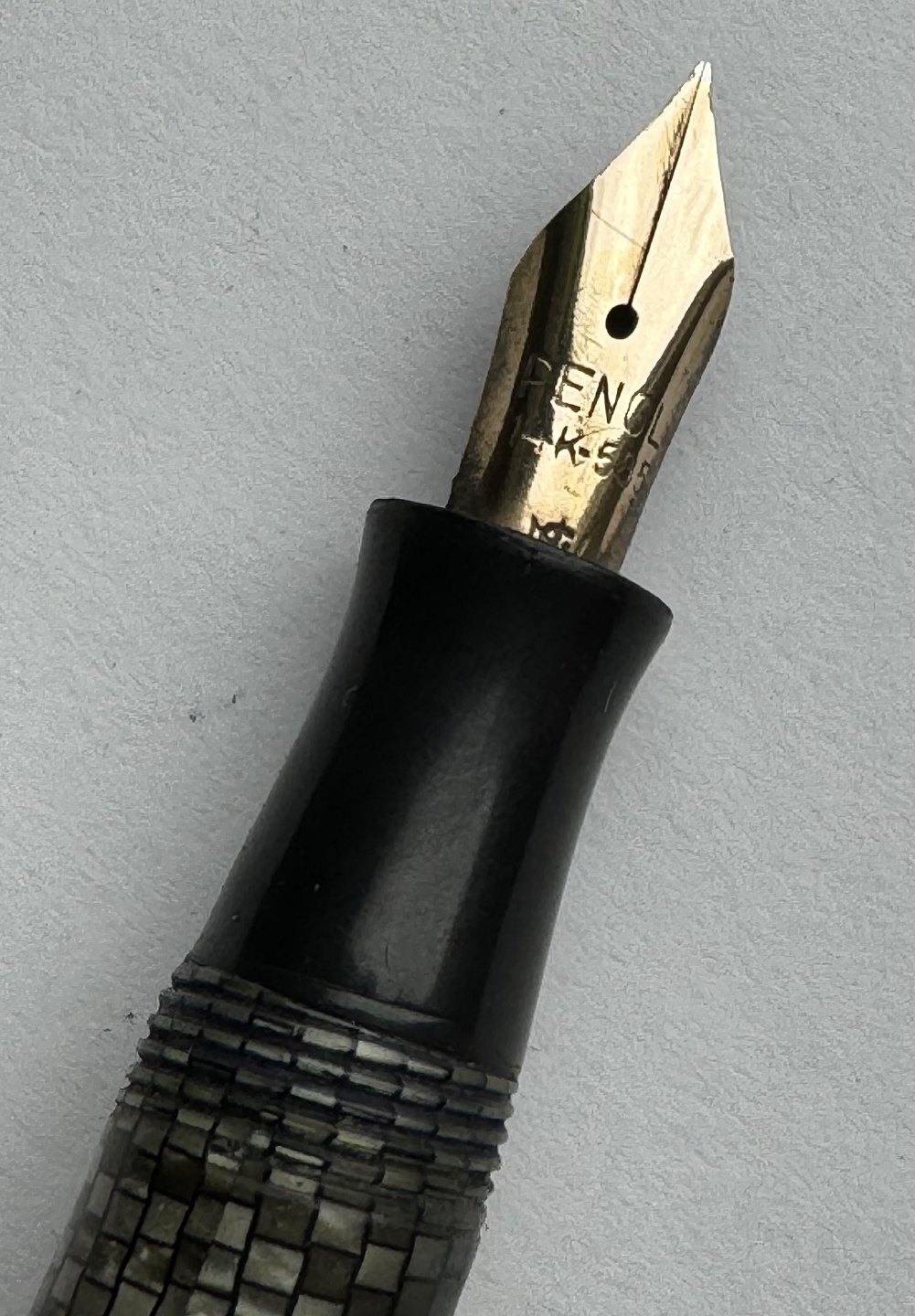Small Penol fountain pen in “snakeskin” made in Denmark around 1940. Appears in good condition without damage or repairs. All parts are original to this model including a 14 carat Penol Gold nib. Does not work. A new rubber sack must be inserted before the pen can absorb ink and write again. Dimensions: 11.2 cm.