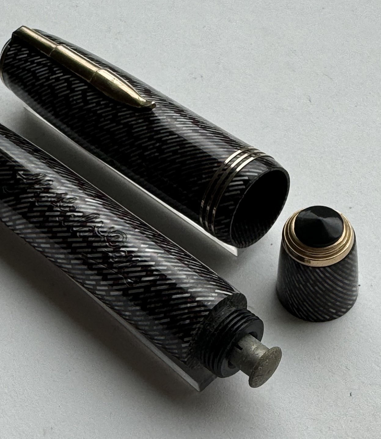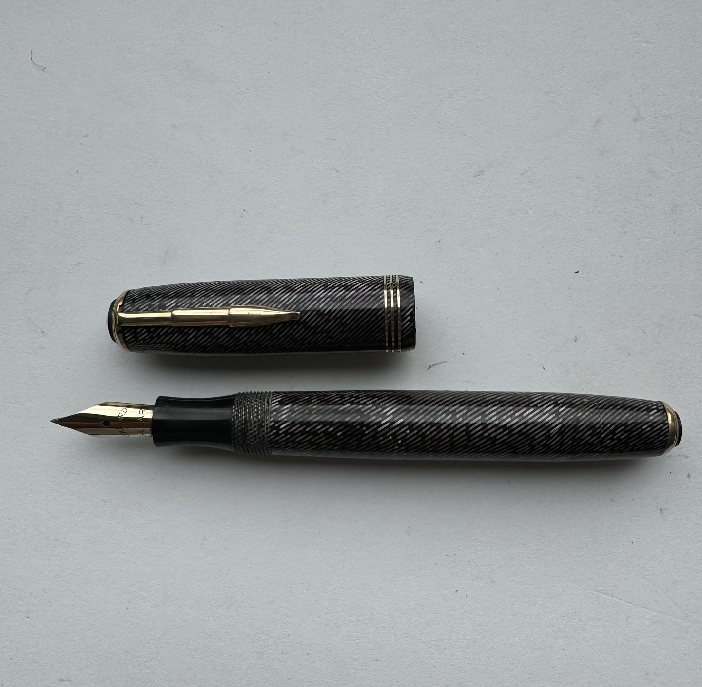 Silver and green spiral striped Sheffield Pen fountain pen made in the 1940s. The nib is a 14 carat gold nib from Oxford. Possibly a Danish product. For example, it has similarities to fountain pens made by Penol. Appears in good condition. Does not work. A new rubber sack must be inserted before the pen can absorb ink and write again. Dimensions: 12.2 cm