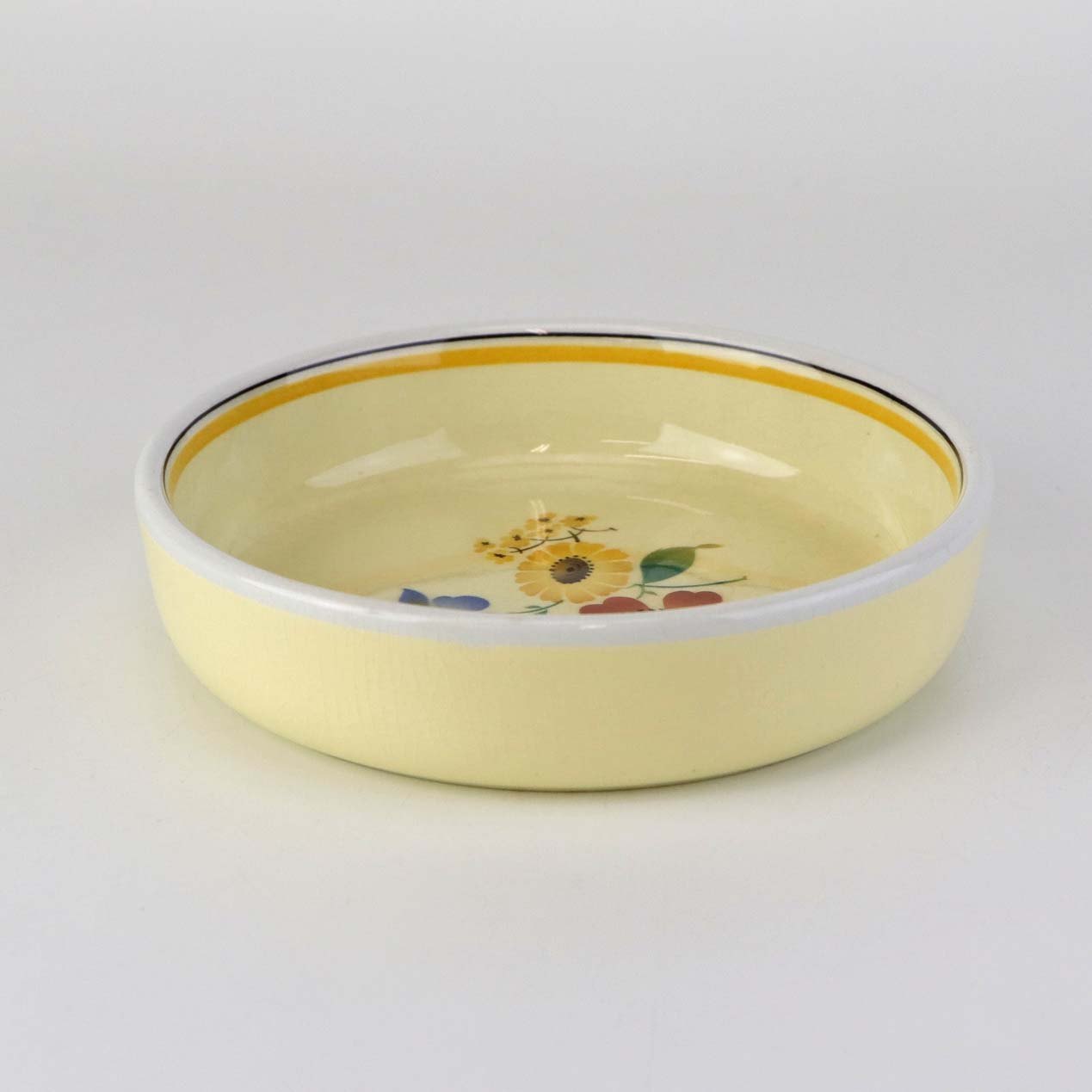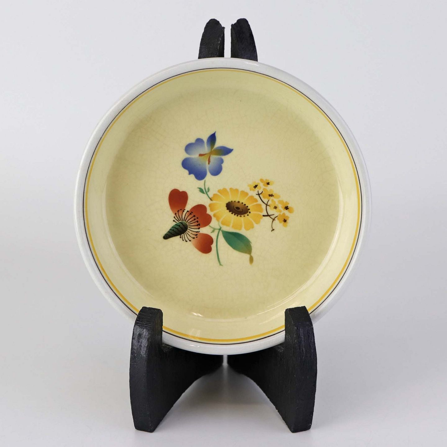Stel i glat gul fajance med dekoration af farverige og forskelligartede blomster samt med gul og sort kantstreg.