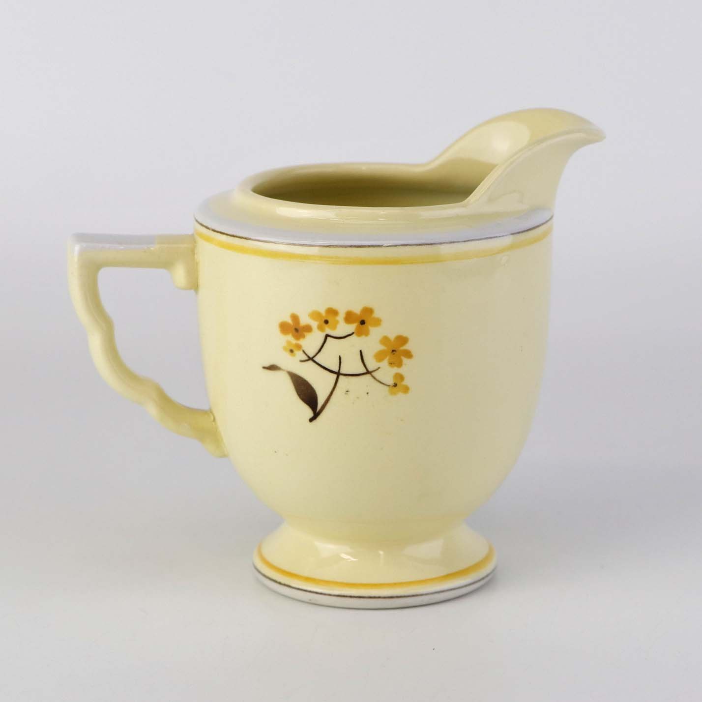 Stel i glat gul fajance med dekoration af farverige og forskelligartede blomster samt med gul og sort kantstreg.