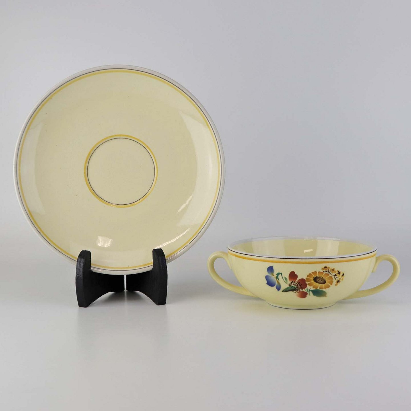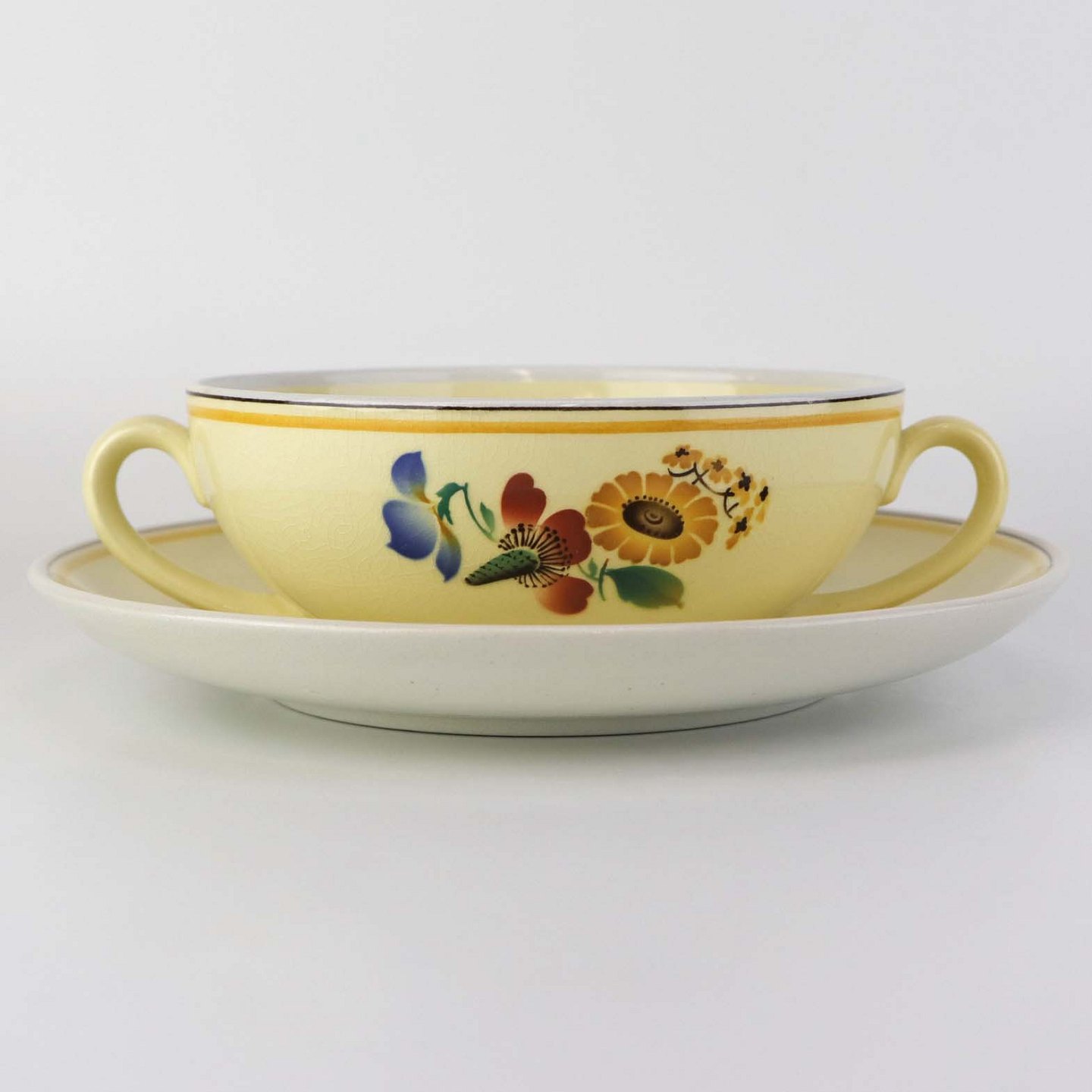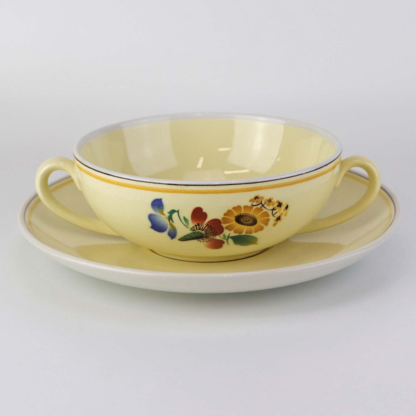 Stel i glat gul fajance med dekoration af farverige og forskelligartede blomster samt med gul og sort kantstreg.