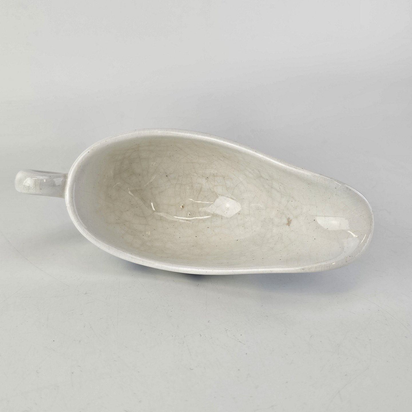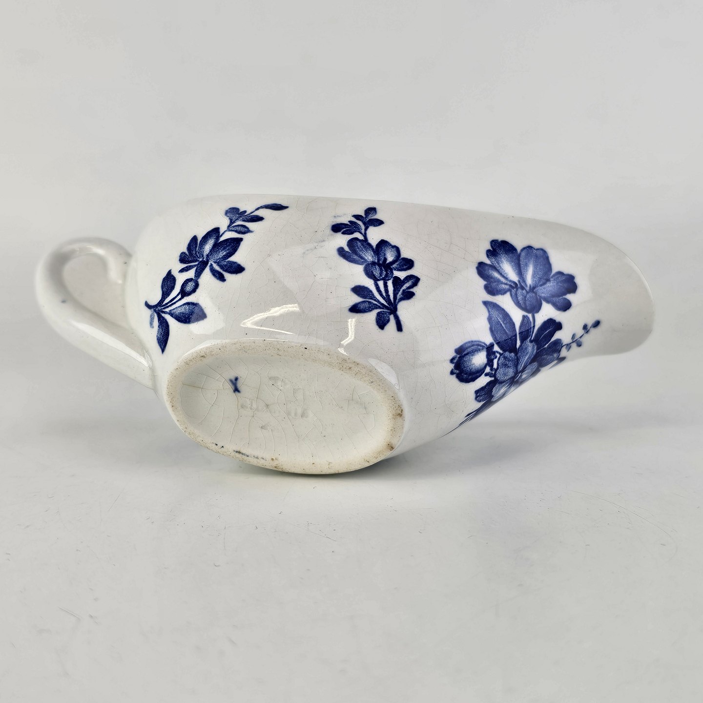 Stel i glat hvid fajance med dekoration af blå blomster og flettet kant