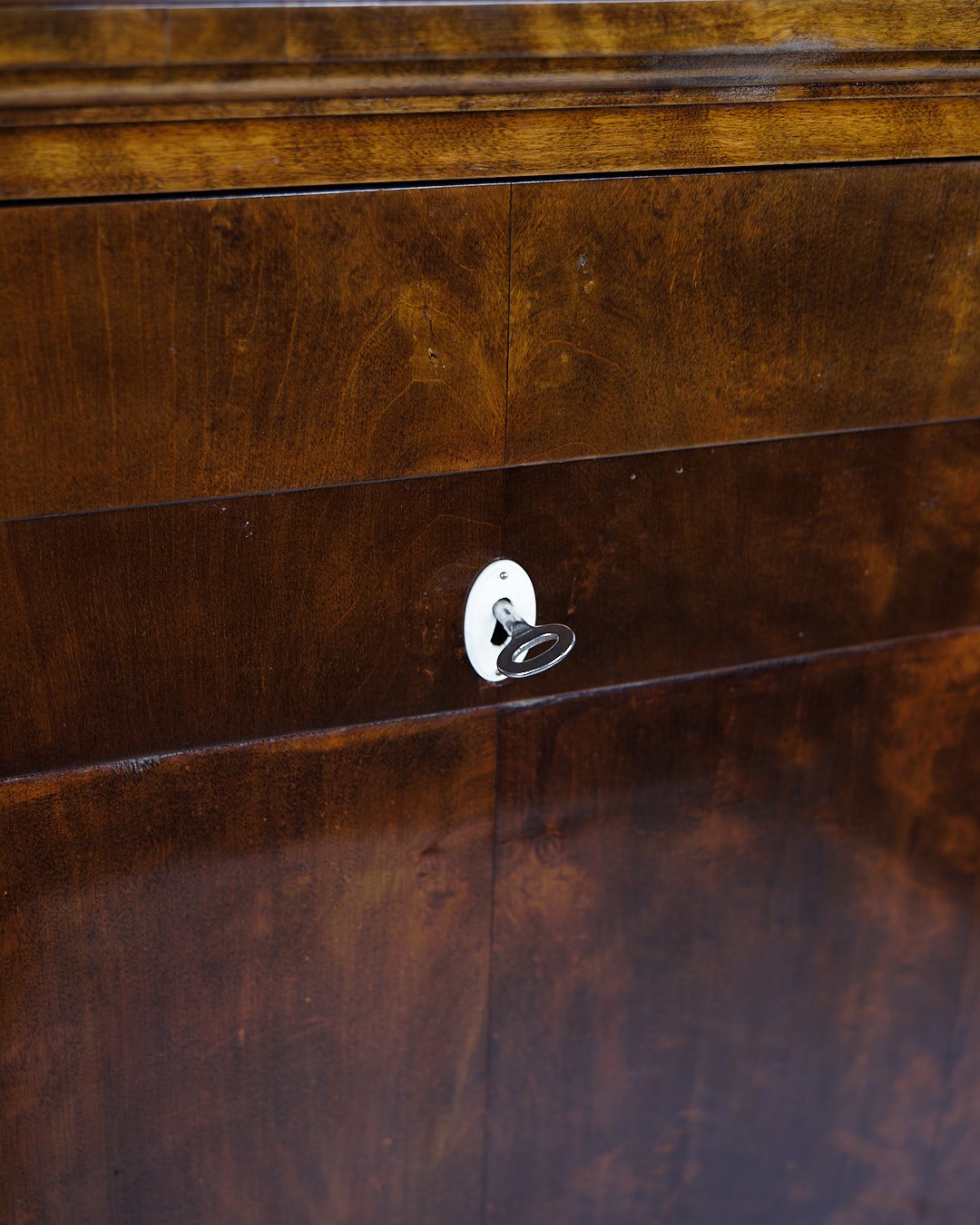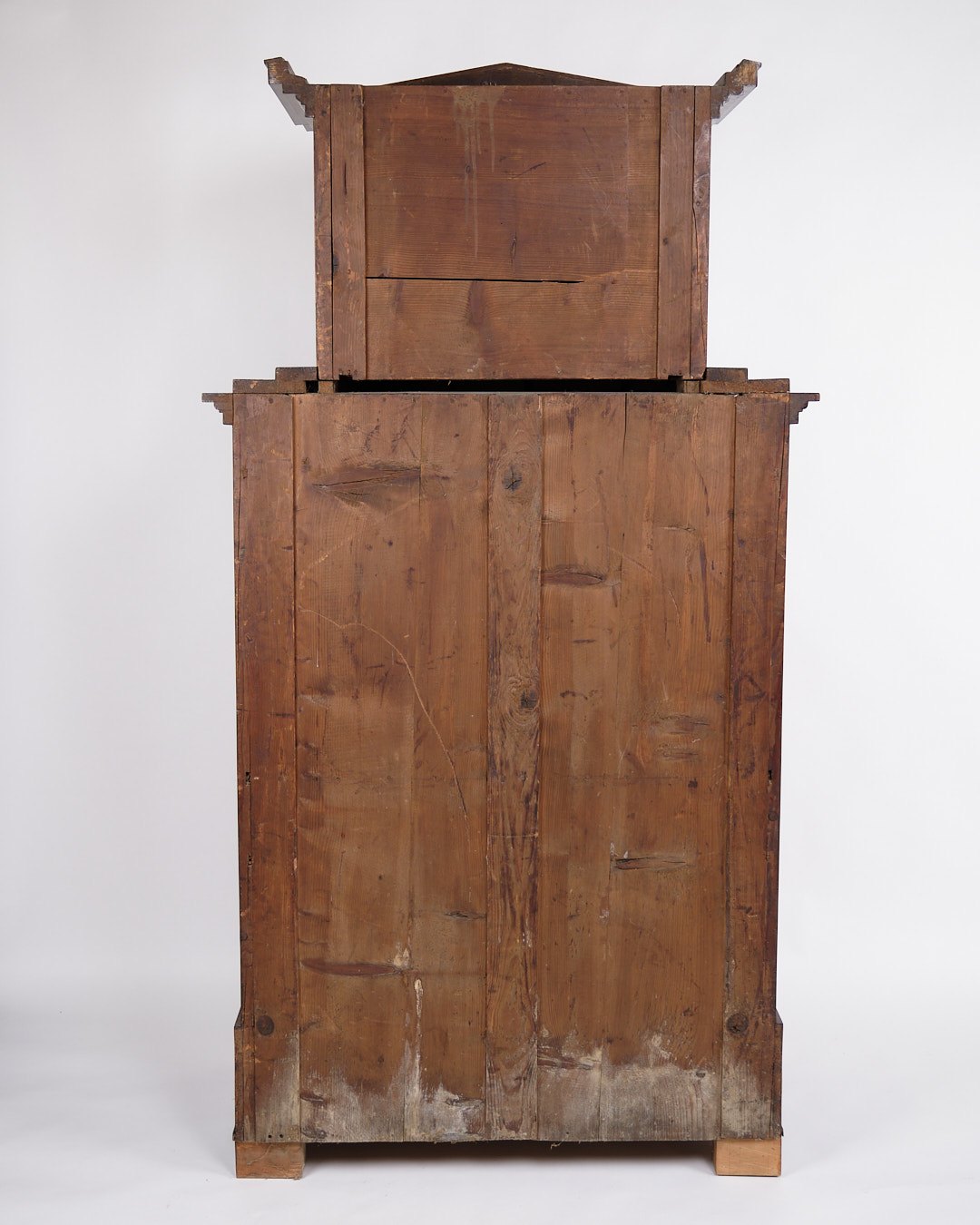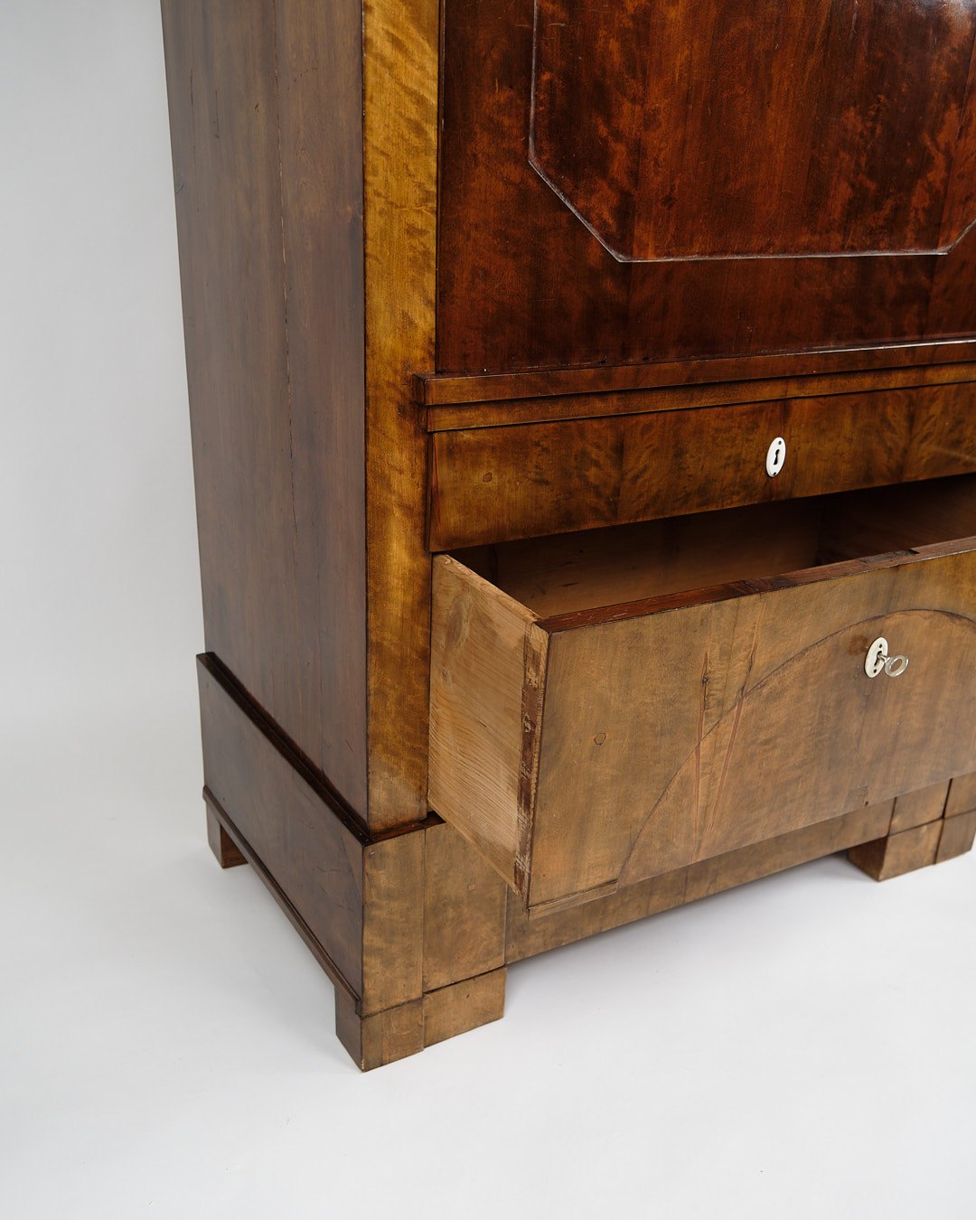 Antique secretary from the 1840s, made of hand-polished birch wood with beautiful intarsia details. The furniture is furnished with two drawers and appears as a fine example of the classic 19th century joinery, where functionality and decorative expression were united.