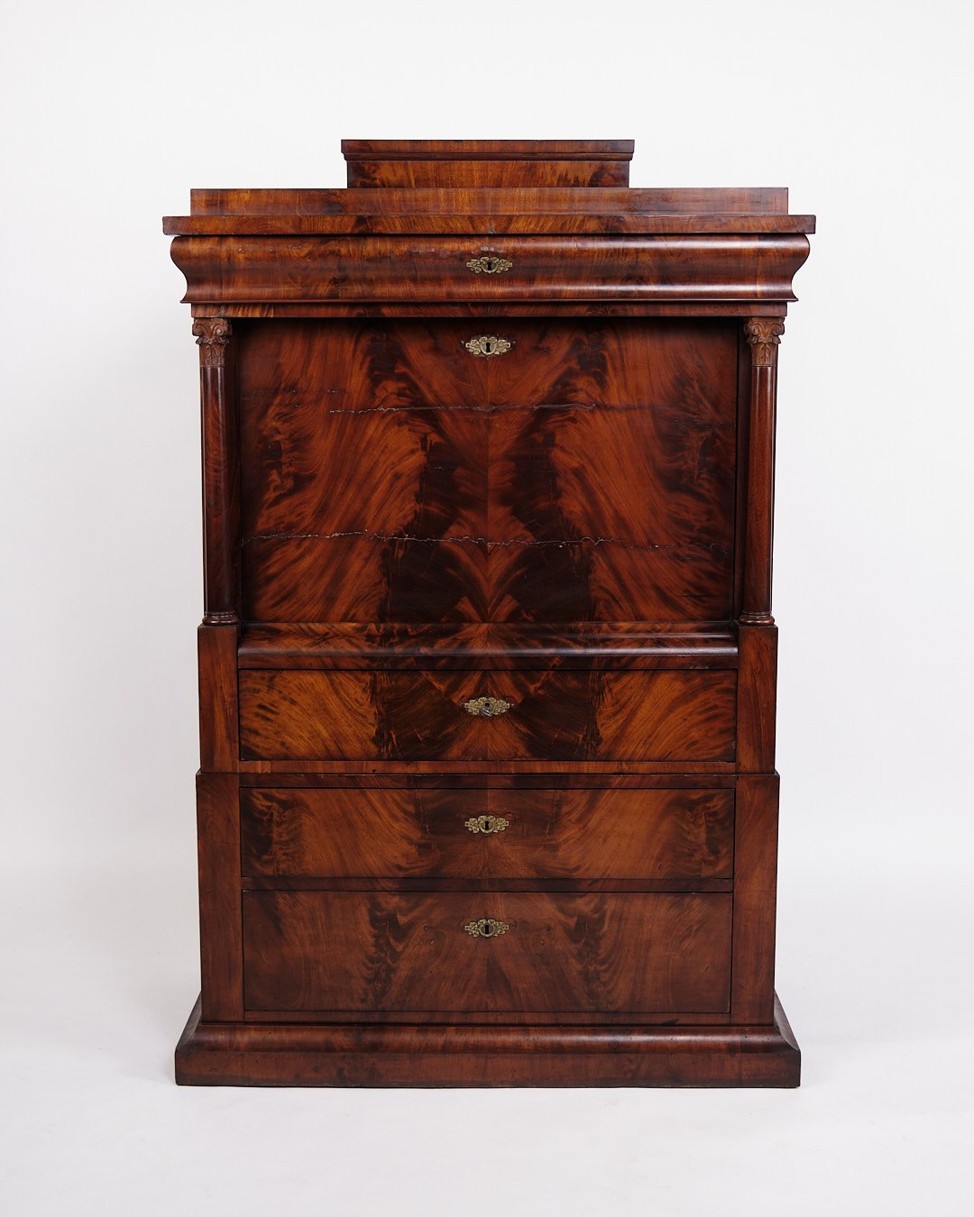 Antique secretary in hand-polished mahogany with flame structure from the 1840s. 4 drawers.