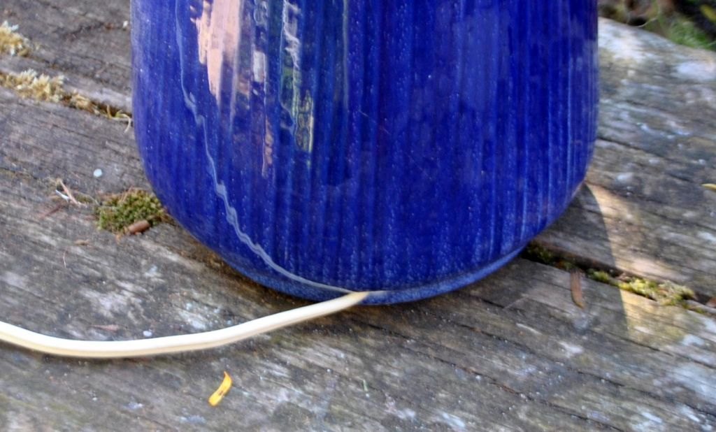 Ceramic table lamp with blue glaze, 20th century. Denmark. With flutes. Unstamped. Height without electrical installation: 37 cm. With electrical installation: 58 cm. Hole drilled in lamp for wire.