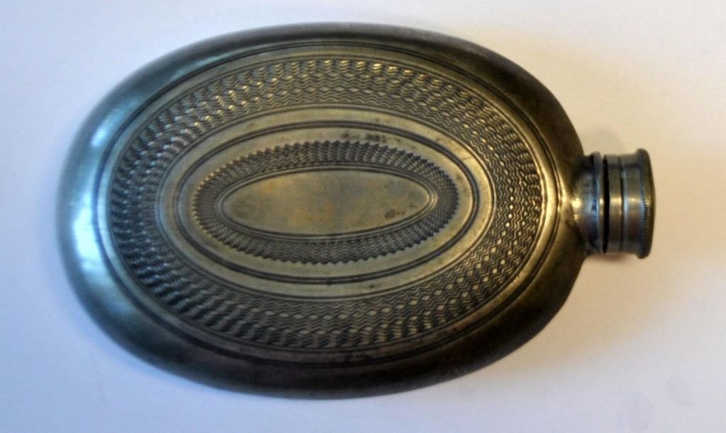 Pewter pocket flask, 19th century. With decorations. Unmarked. 11.5 x 7.5 cm.