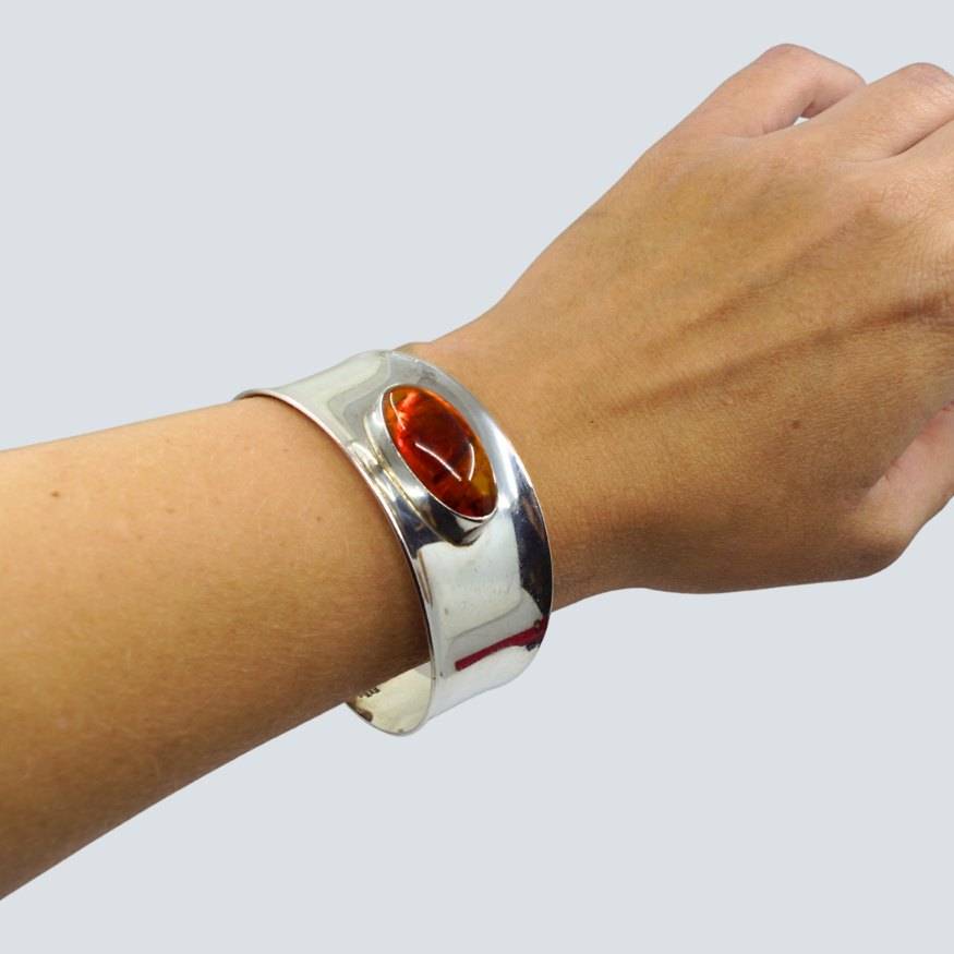 N. E. From; A bangle of sterling silver set with amber.