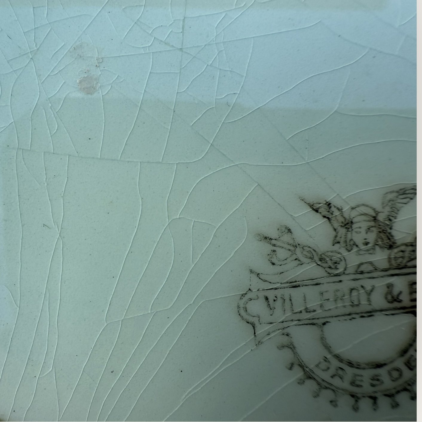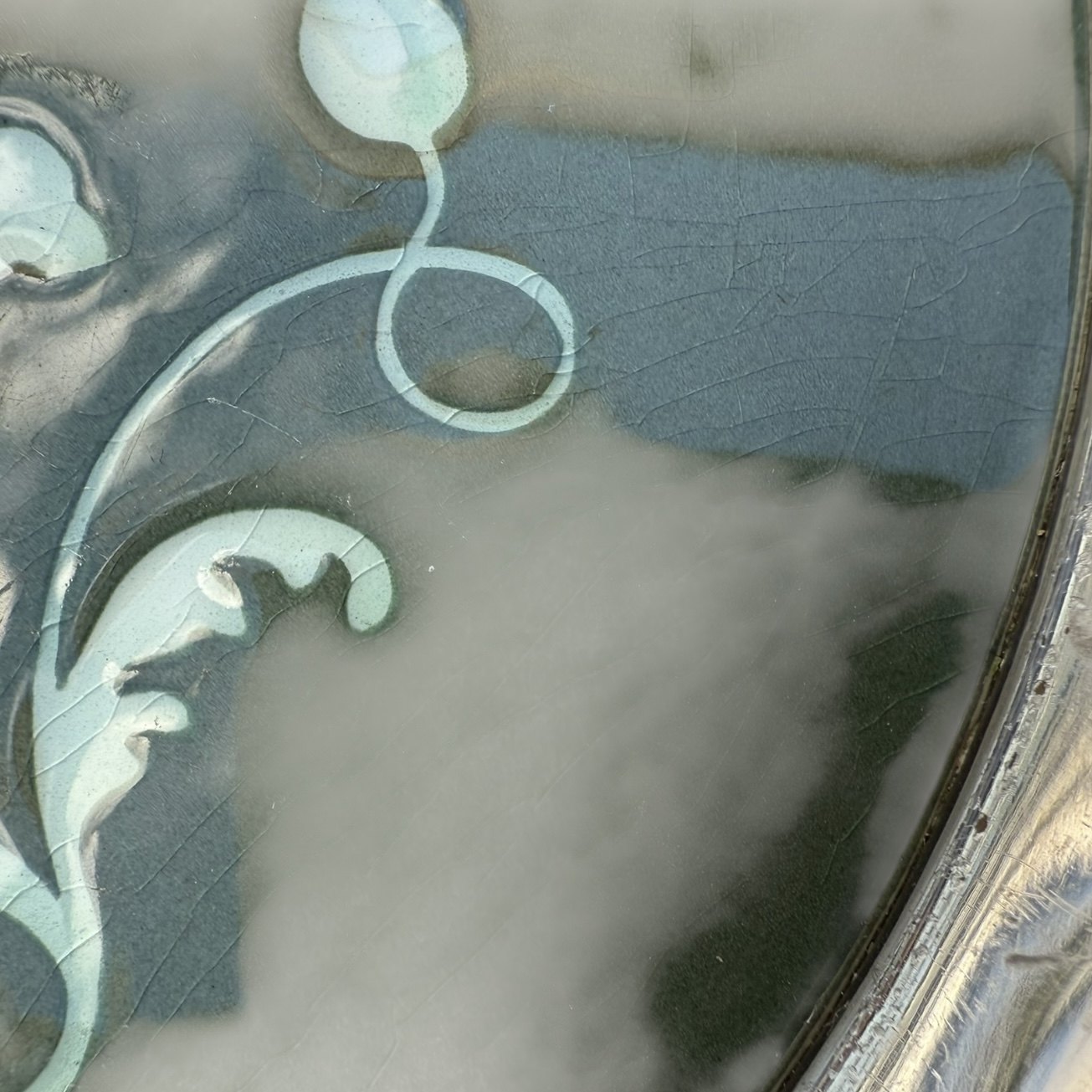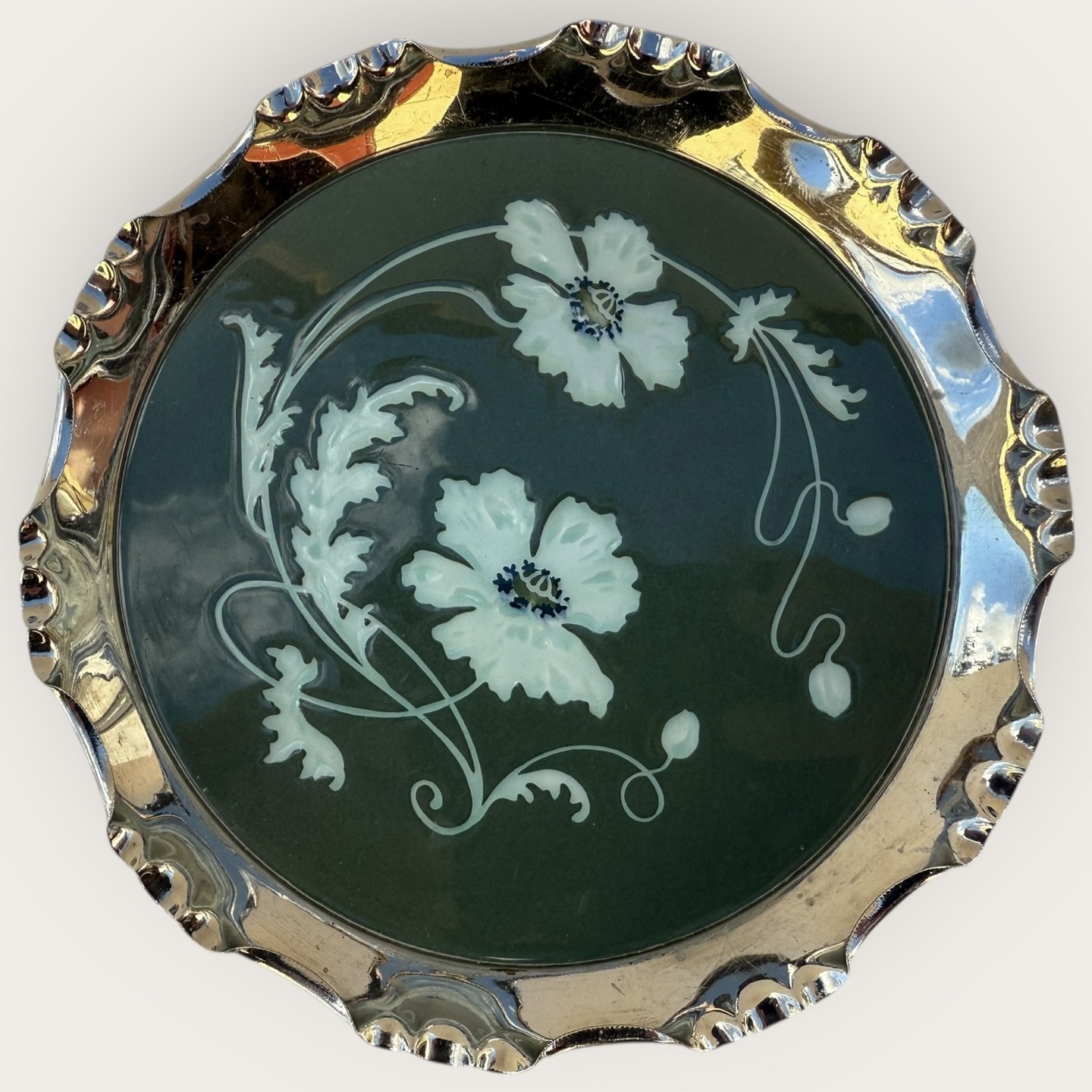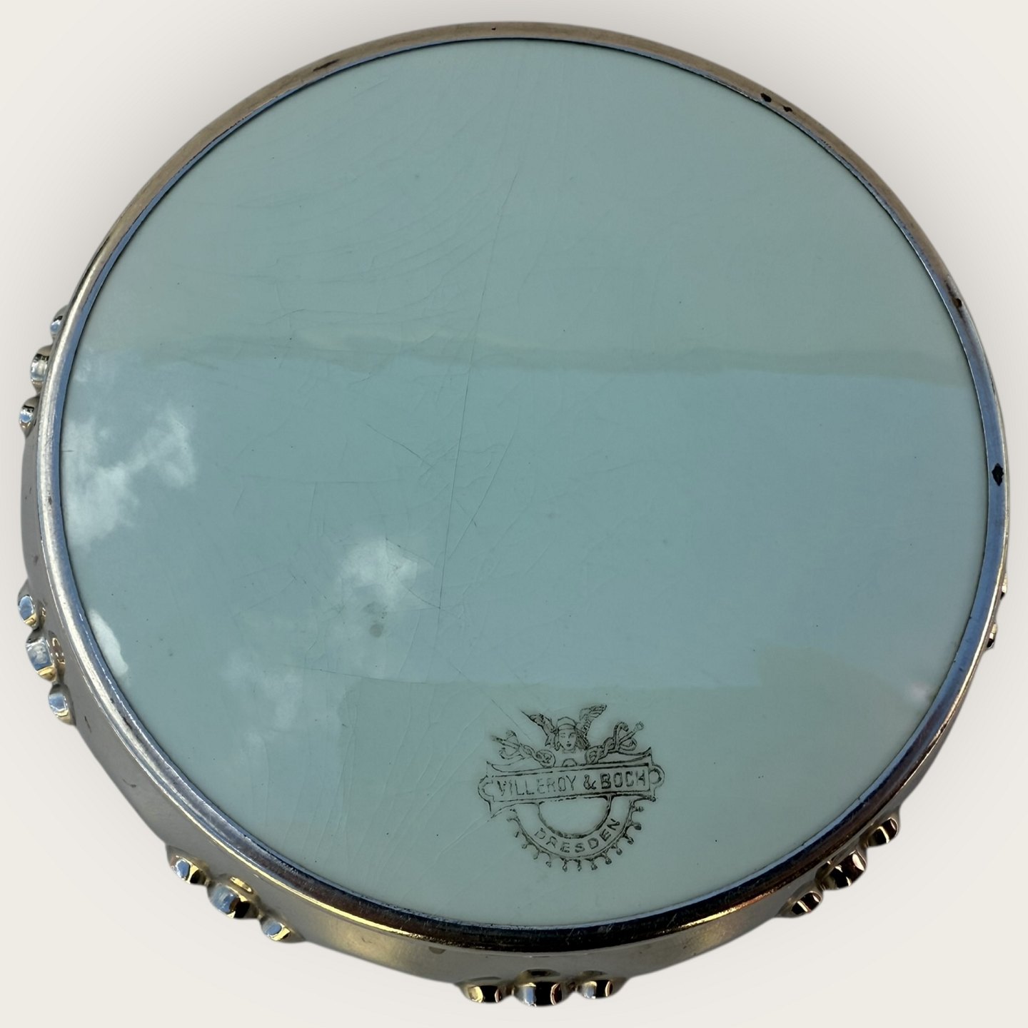 Villeroy & Boch, Bottle tray / dish, diameter 17cm, Jugendstil / Art Nouveau in porcelain and with silver plated rim, some small cracks under the glaze (see photo) otherwise in good condition
