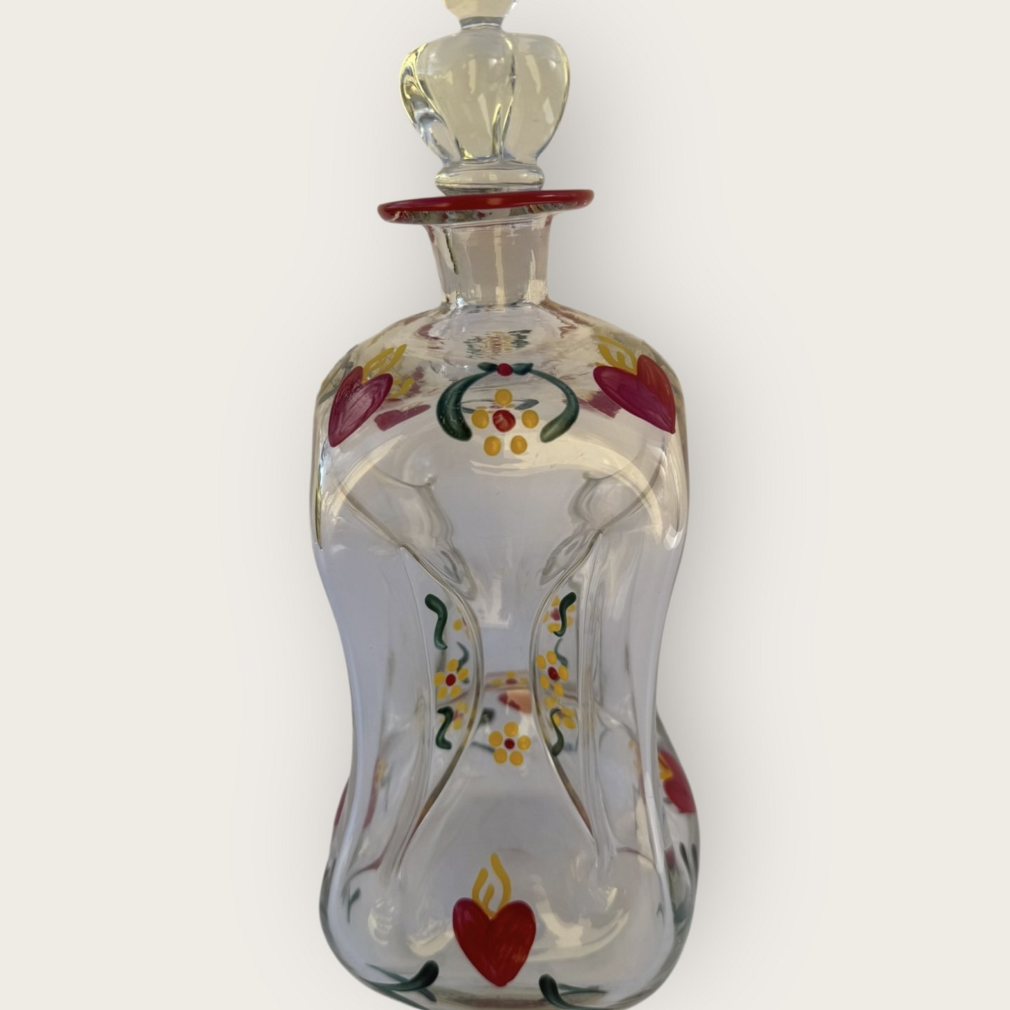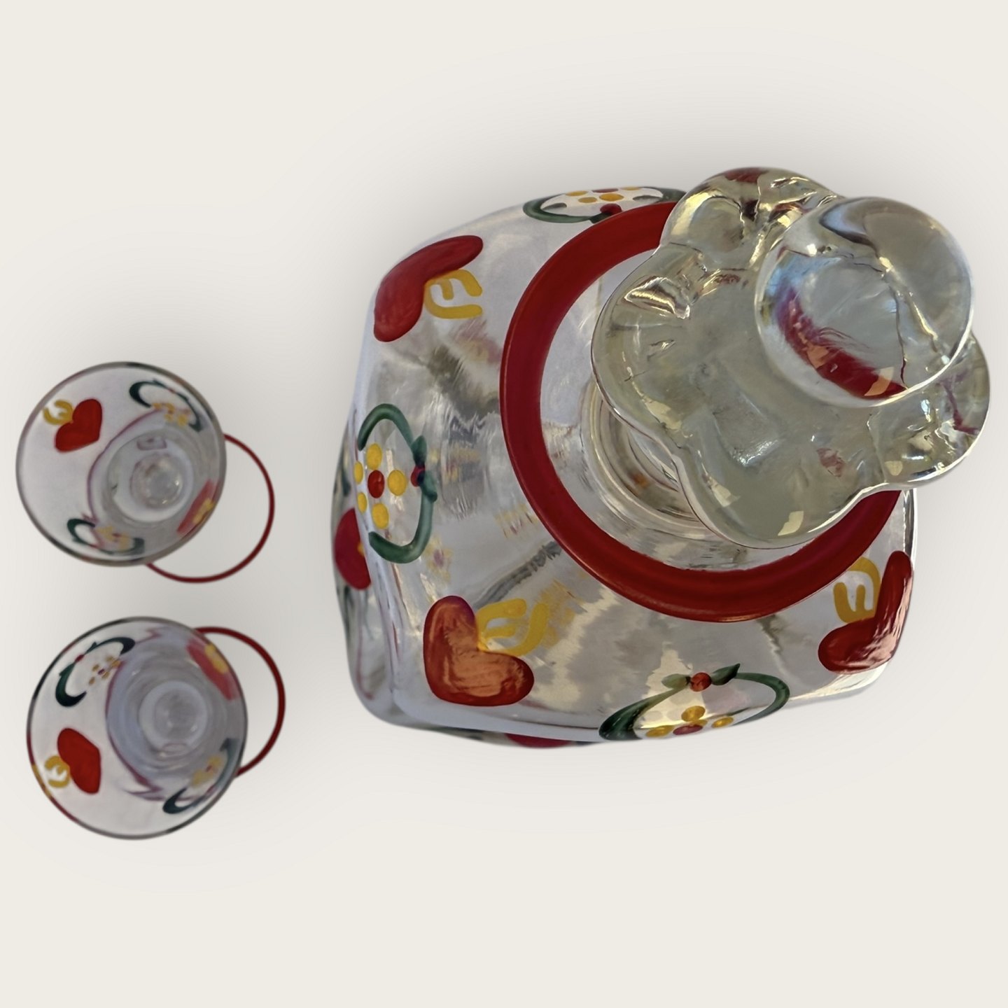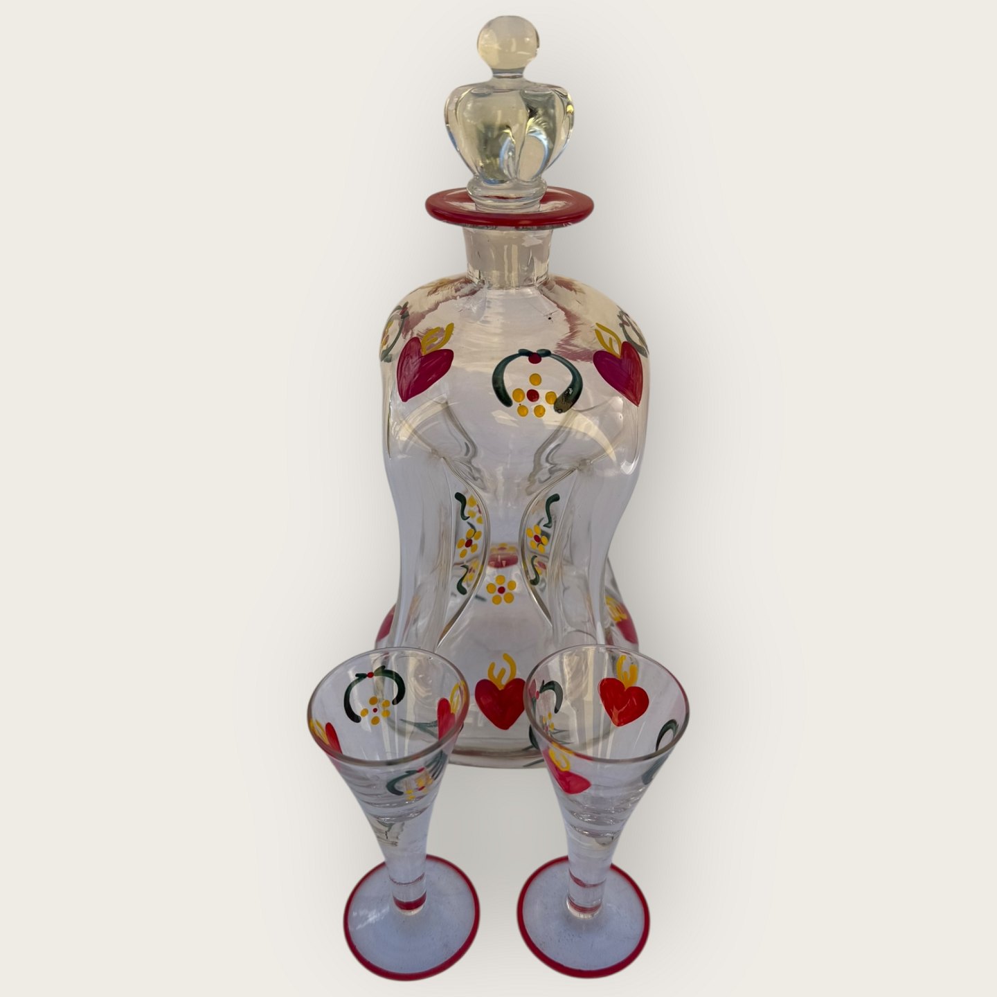 Holmegaard, Painted kluk bottle with crown stopper and 2 glasses, decorated with red hearts etc.; Height 25cm, height schnapps glass 10cm