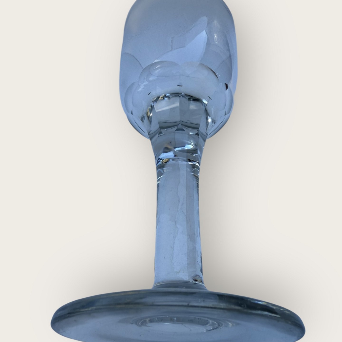 Tall older glasses with a cut stem, wide bowl and thick glass, height 21.3cm, diameter 9cm