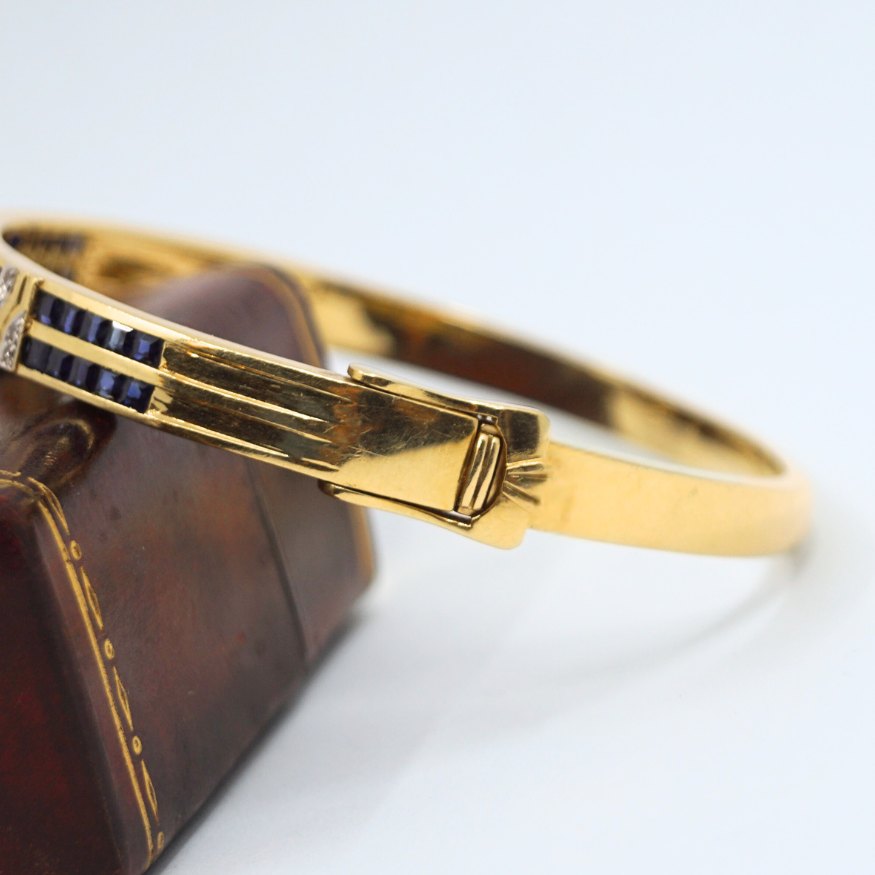 Armring af 18 kt. guld, prydet med en safirer og diamanter. Armringen kan åbnes. Med kasselås, samt dekorativ sikkerhedslås.