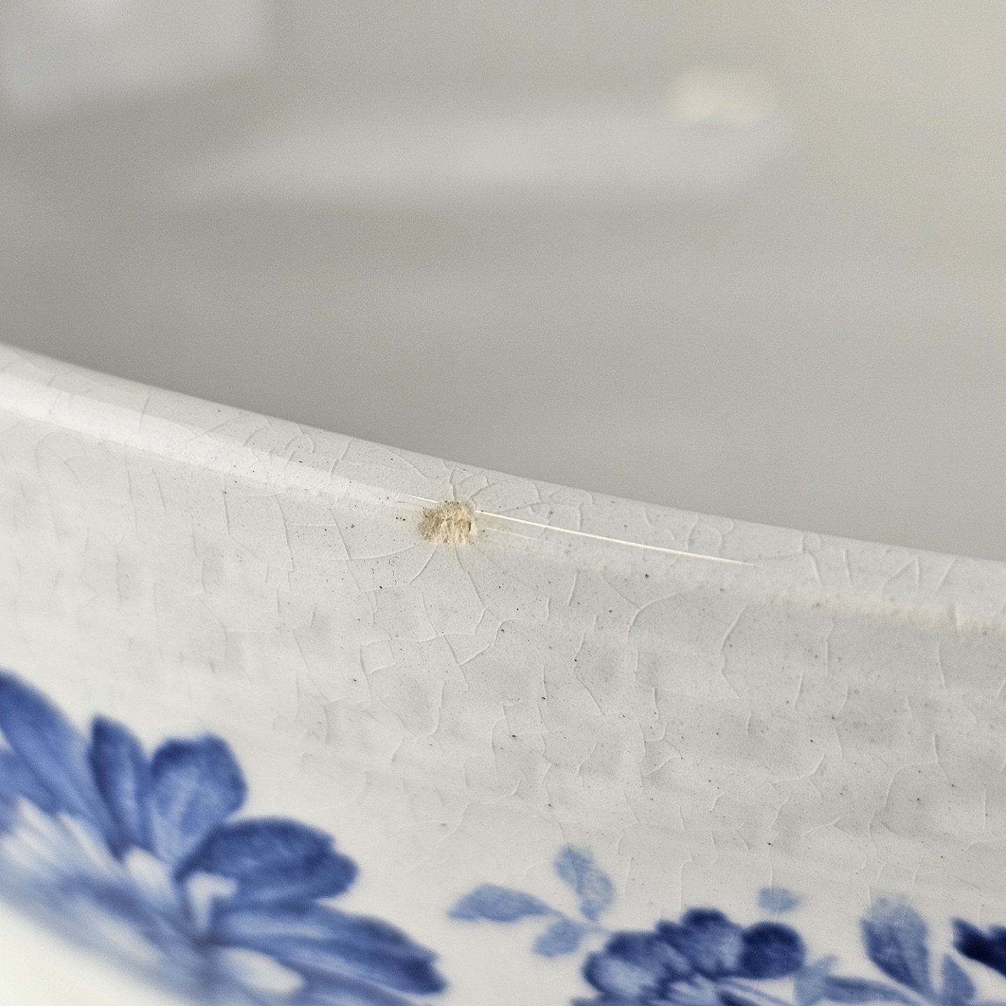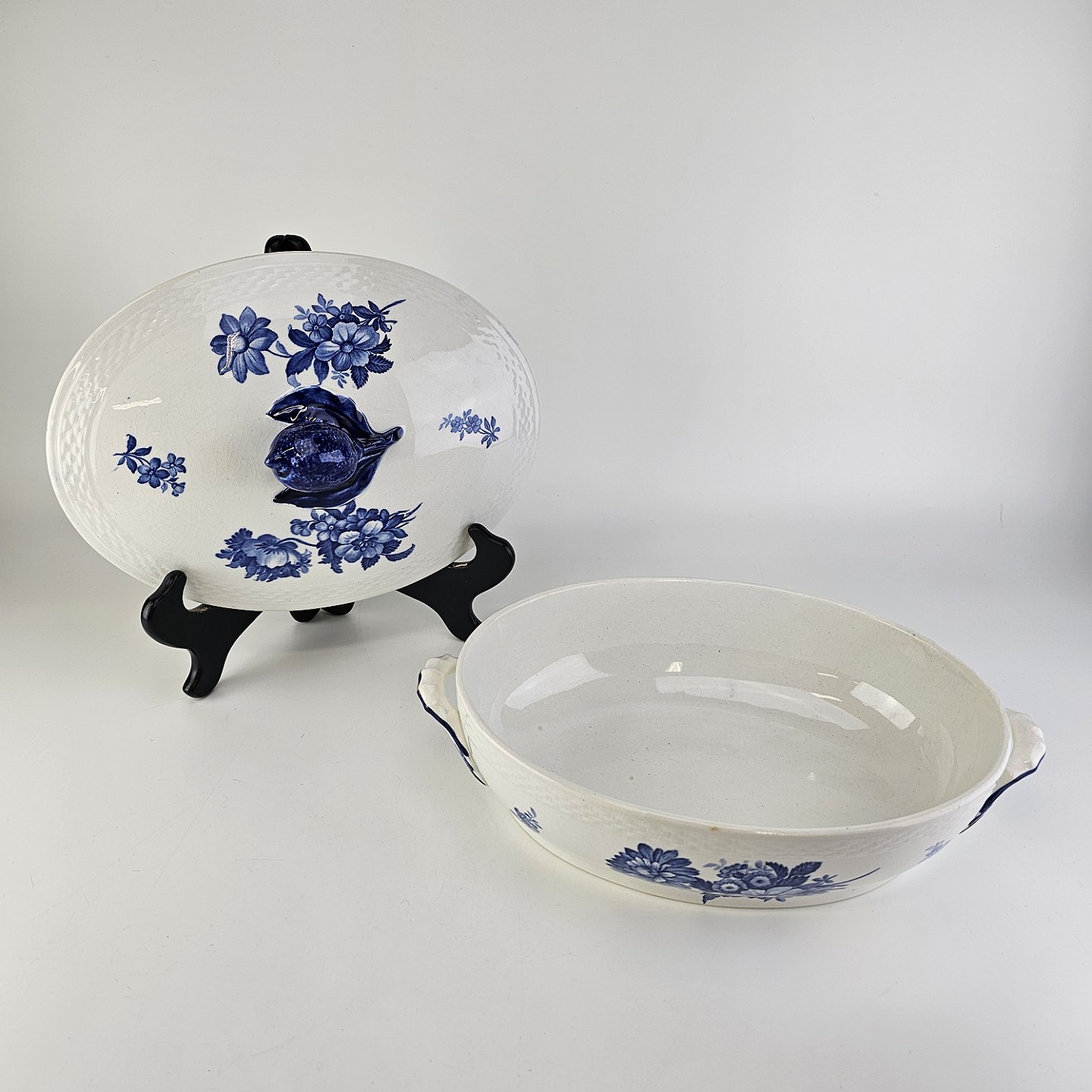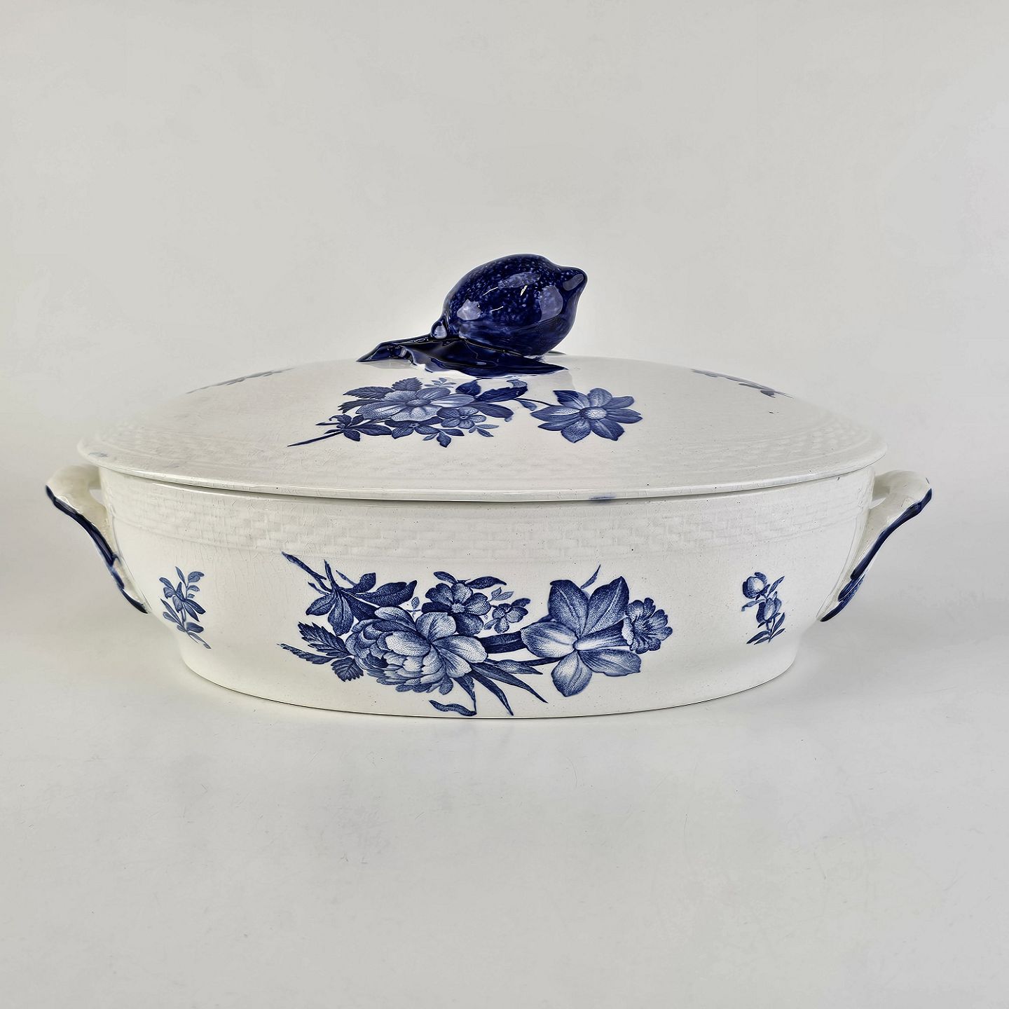 Stel i glat hvid fajance med dekoration af blå blomster og flettet kant