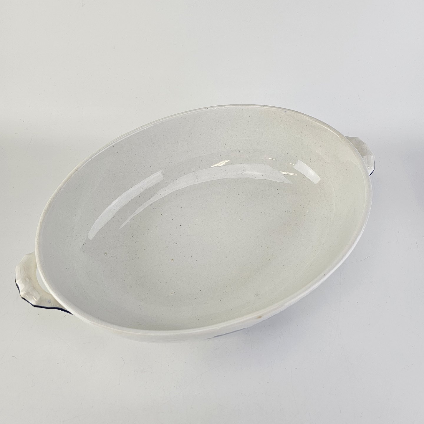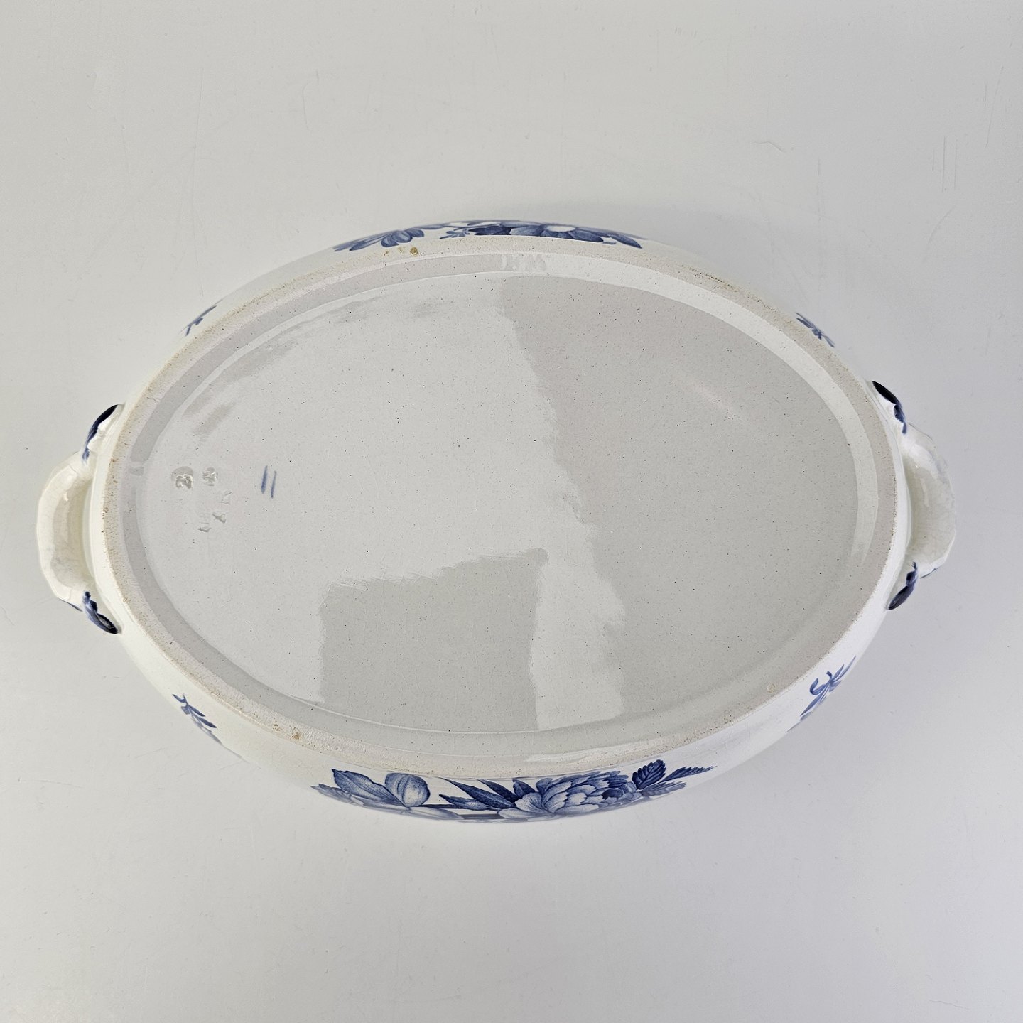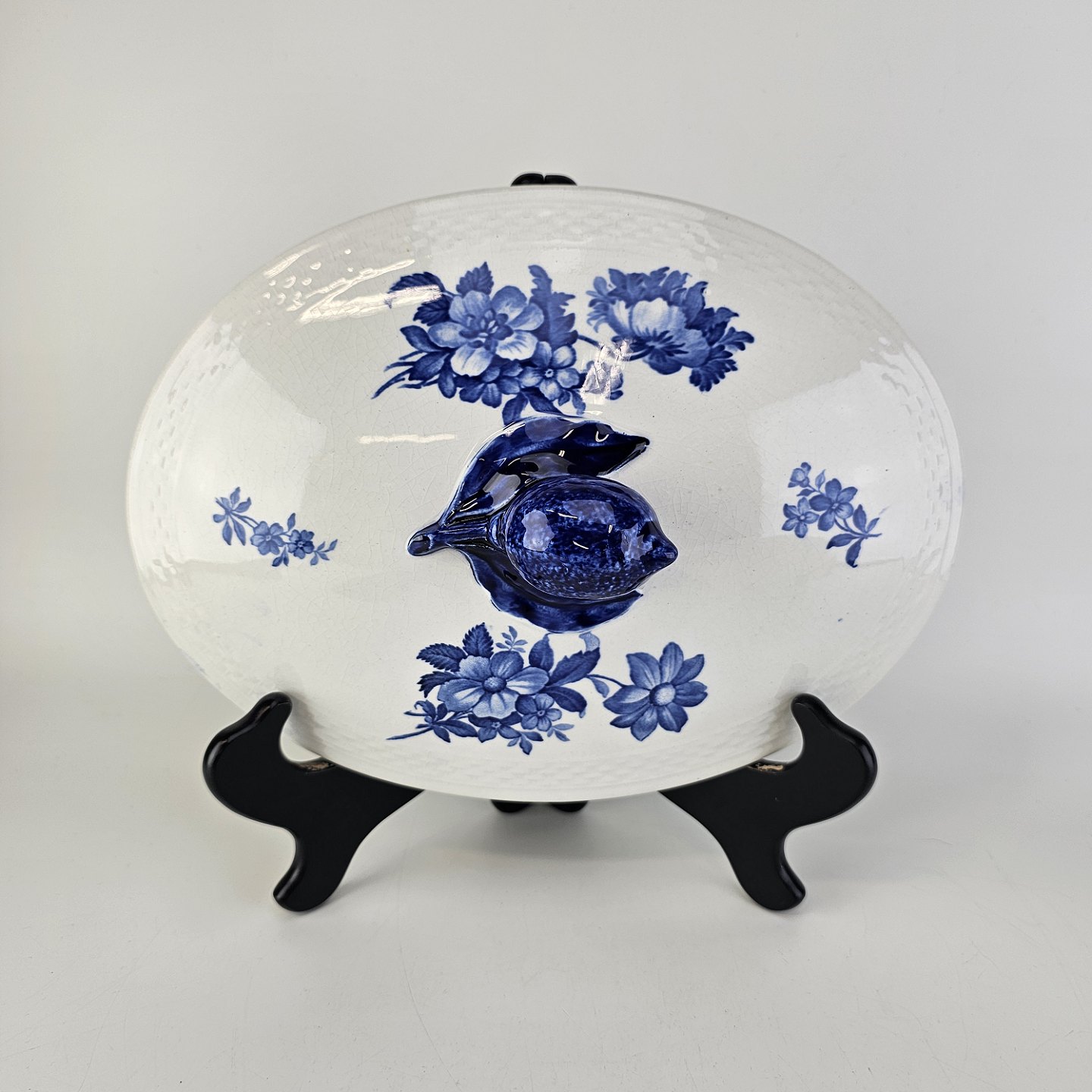 Stel i glat hvid fajance med dekoration af blå blomster og flettet kant