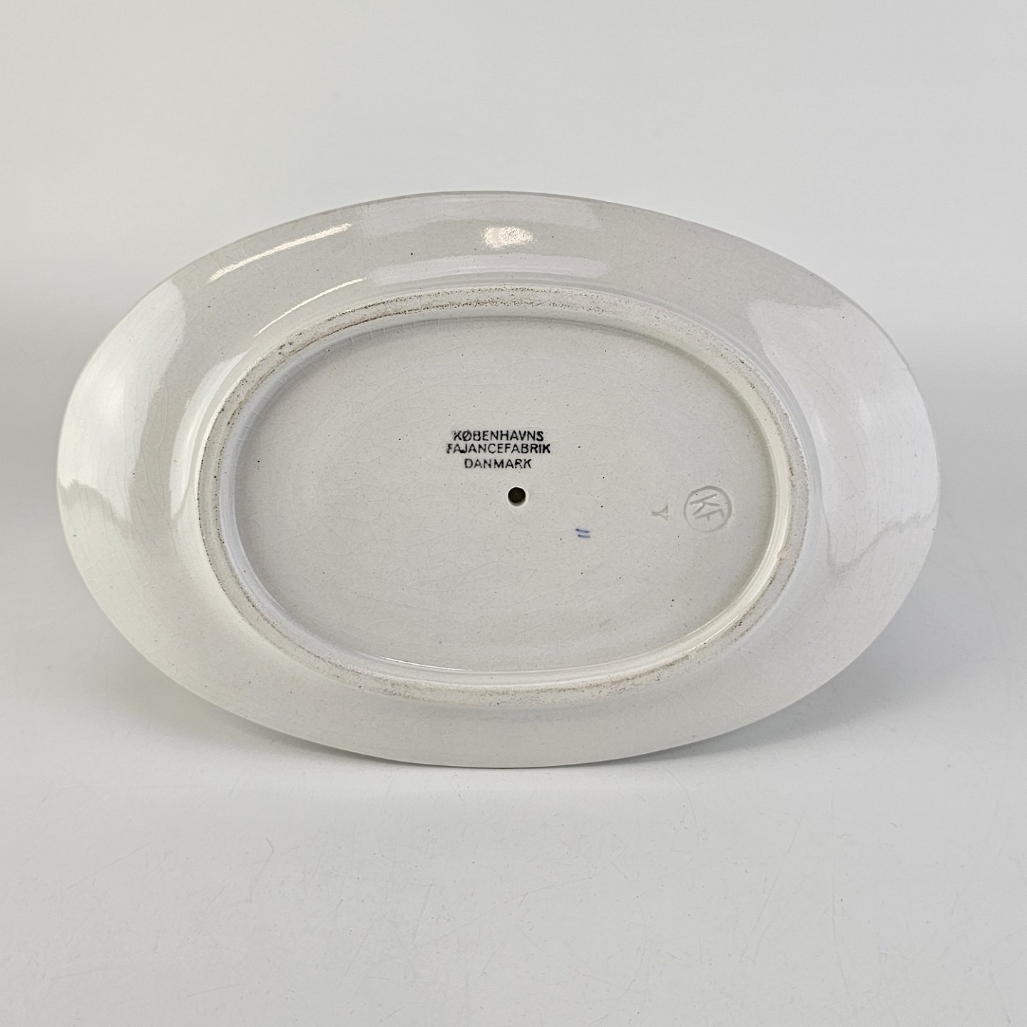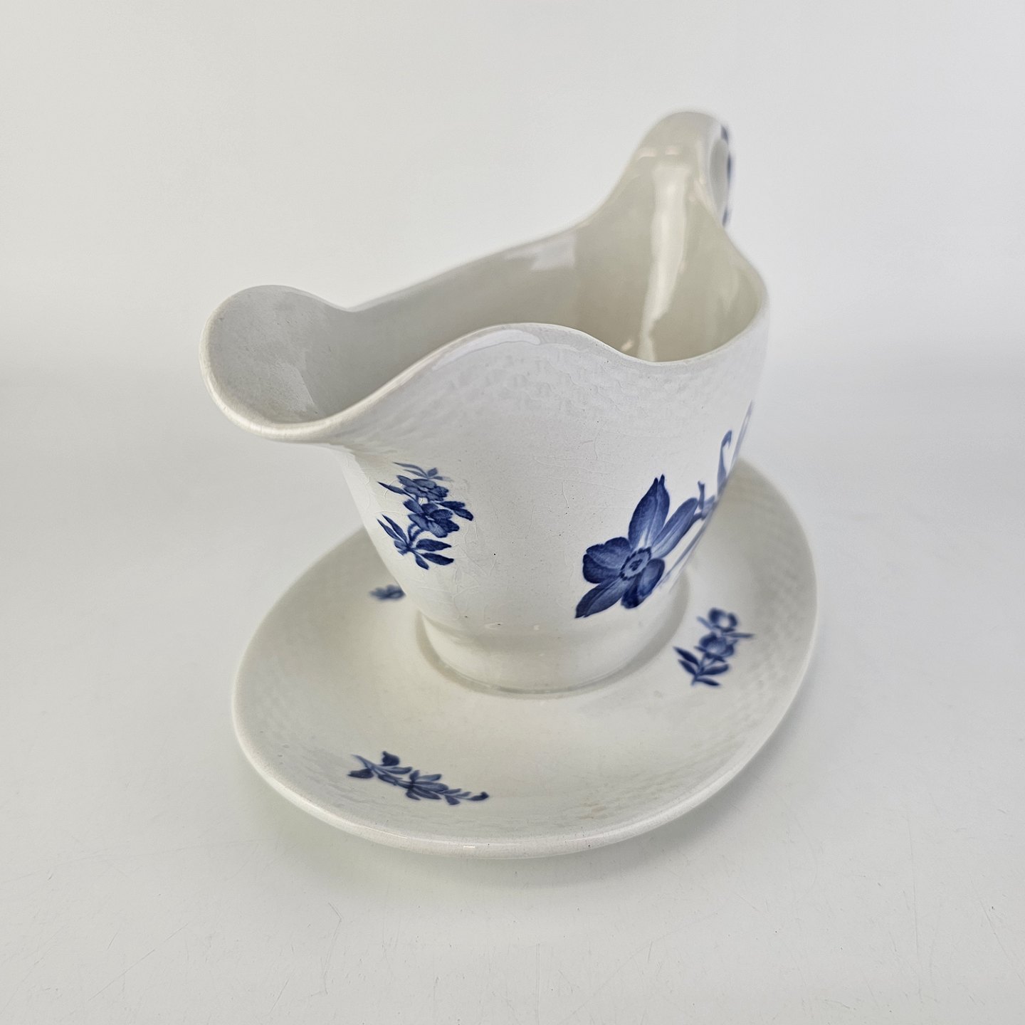 Stel i glat hvid fajance med dekoration af blå blomster og flettet kant