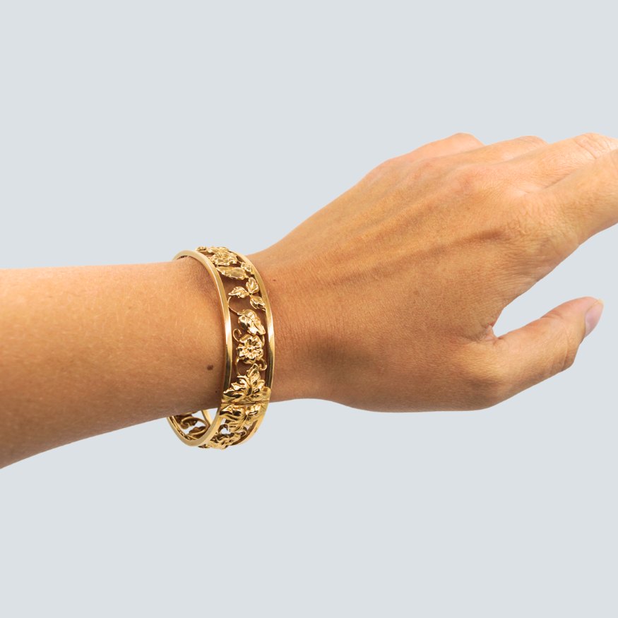 A bangle made of 18k gold, with floral motif. From Stockholm 1947. The bangle can be opened. With clasp and two safety clasp.