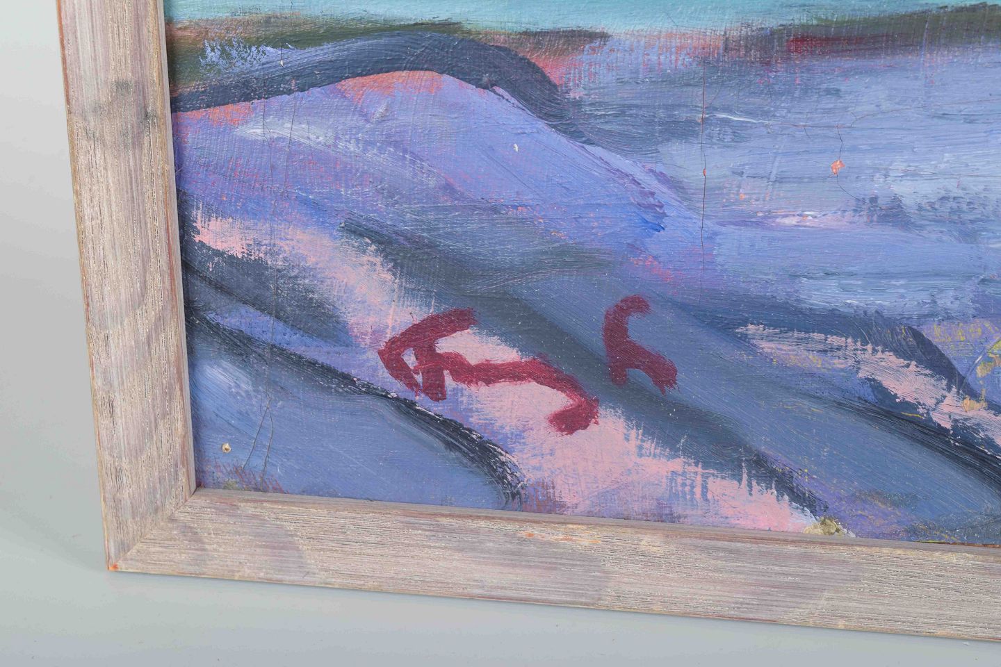 An expressive landscape painting executed in a colorful and simplified style, where blue and violet tones dominate the foreground, while green and yellow fields suggest meadows and vegetation. The painting is characterized by vigorous brushwork and an almost abstract composition, in which natural forms dissolve into rhythmic fields of color.