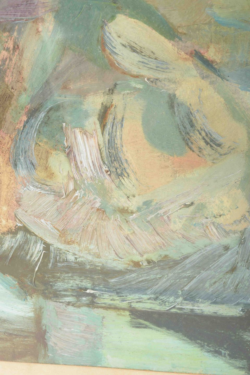 An expressive abstract work with sweeping brushstrokes in green, blue, and brown tones, creating a vivid sense of rhythm and movement. Painted during Lindgren’s early explorations of abstraction in the late 1950s, the piece reflects his focus on the materiality of color and dynamic composition.