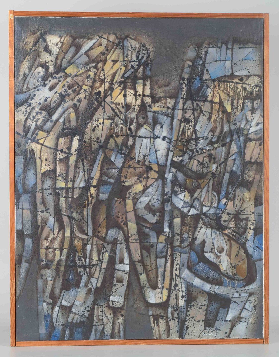 An expressive and complex abstract painting, where figurative and organic forms intertwine in a rhythmic network of lines and color fields in blue, brown, and golden tones. The work reflects Lacomblez’s characteristic surrealist-abstract language and his fascination with mythology and the dreamlike.