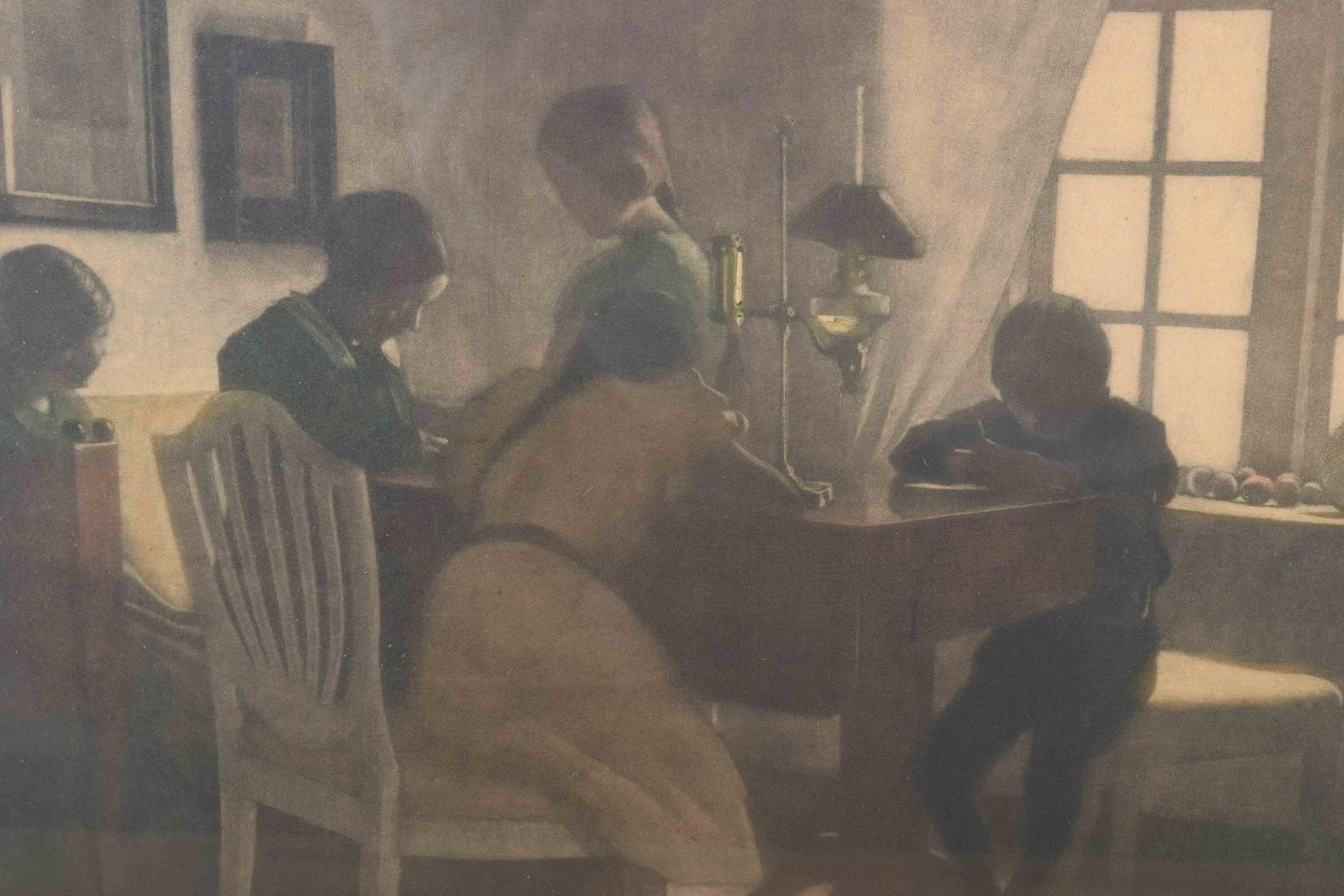 A tranquil interior scene by Peter Ilsted, depicting a group of figures gathered around a table in the soft glow of Nordic daylight. The composition highlights Ilsted’s distinctive use of calm, simplicity, and light, creating an intimate and timeless atmosphere. The work can be dated to around 1910–1925, Ilsted’s mature period, when he refined his mastery of the color mezzotint technique.