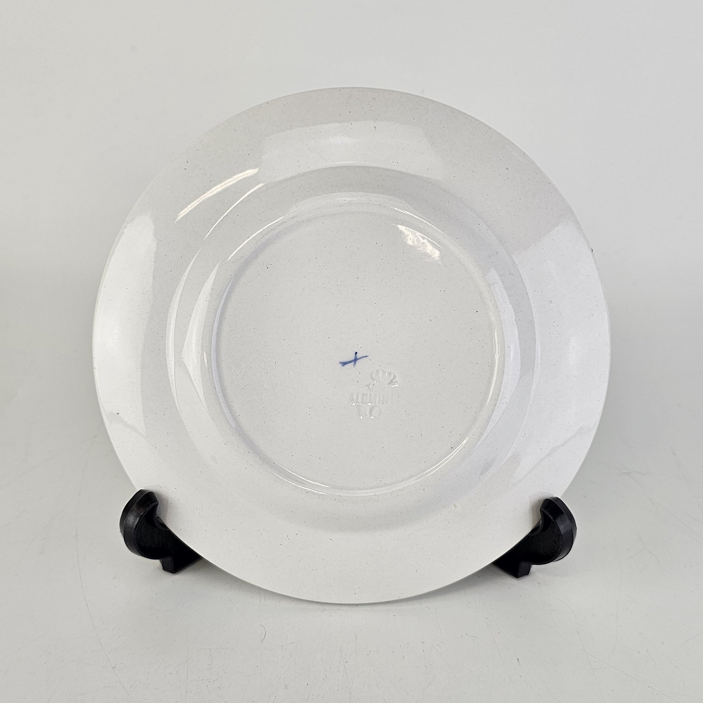 Stel i glat hvid fajance med dekoration af blå blomster og flettet kant