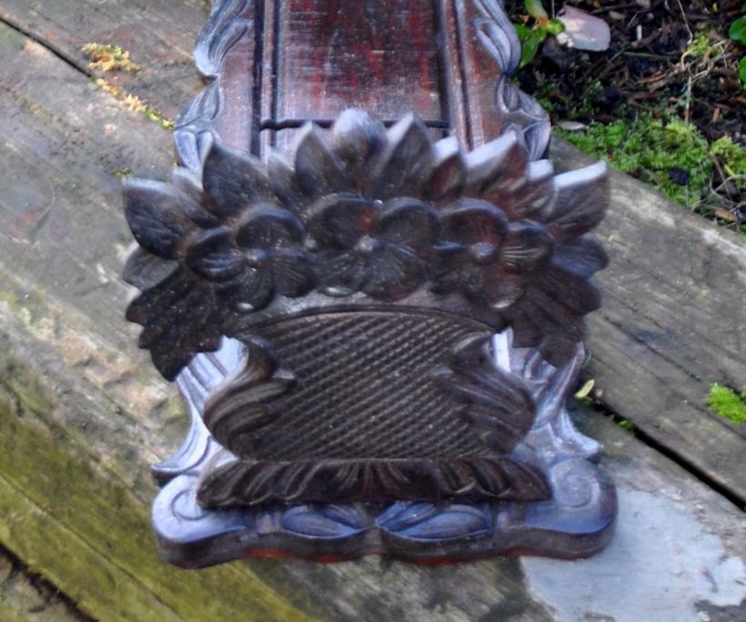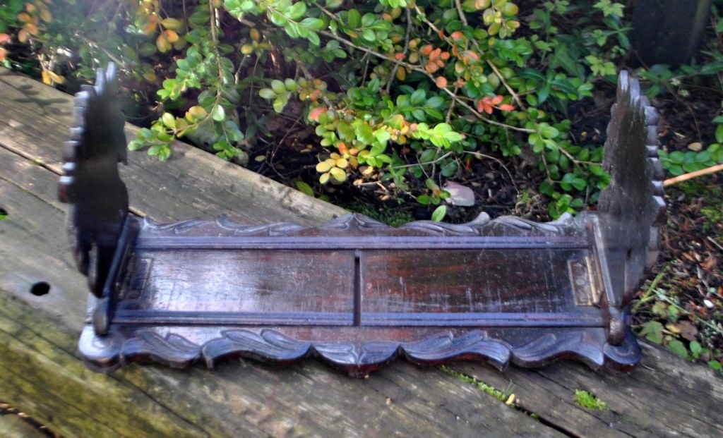 Antique travel bookcase. 19th century. Probably Germany. With carvings in the form of baskets with flowers as end pieces. H.: 21 cm. Length assembled: 44 cm. Length extended: 83 cm.