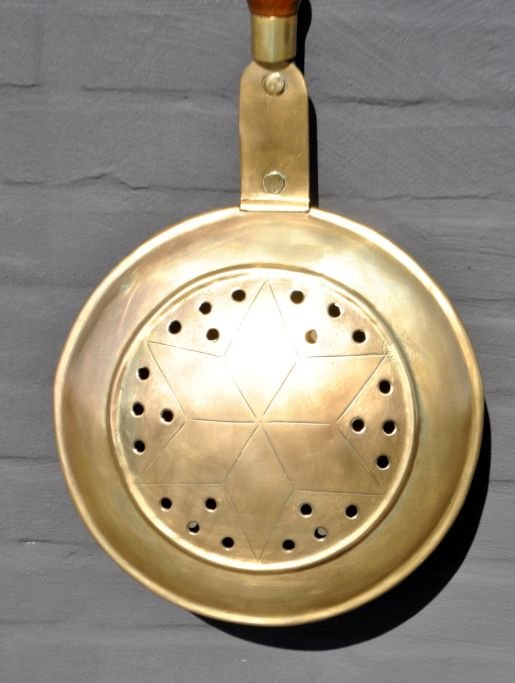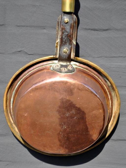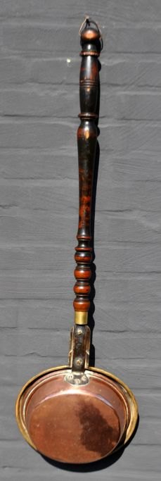 Copper and brass heating basin, 19th century. Brass lid decorated with star. Brass lid is newer than the base. Wooden handle. Stamped. L: 100 cm. Dia: 29 cm.