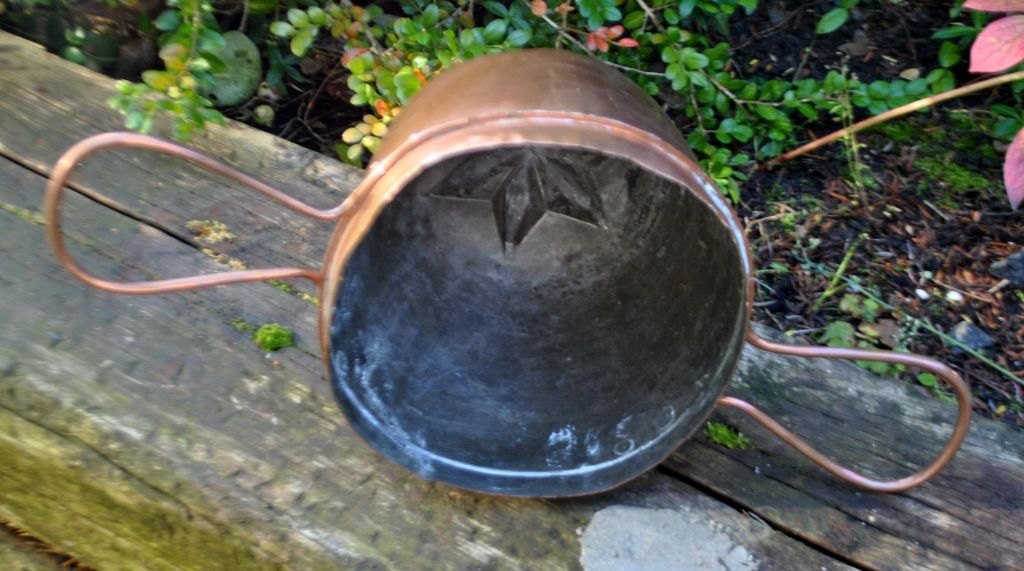 Pâté or meat dish, copper, 19th century. Denmark. With two handles and decoration in the shape of a star. Dia: 21.5 cm. Dia. incl. handle: 46 cm. H: 19 cm. No visible stamps.