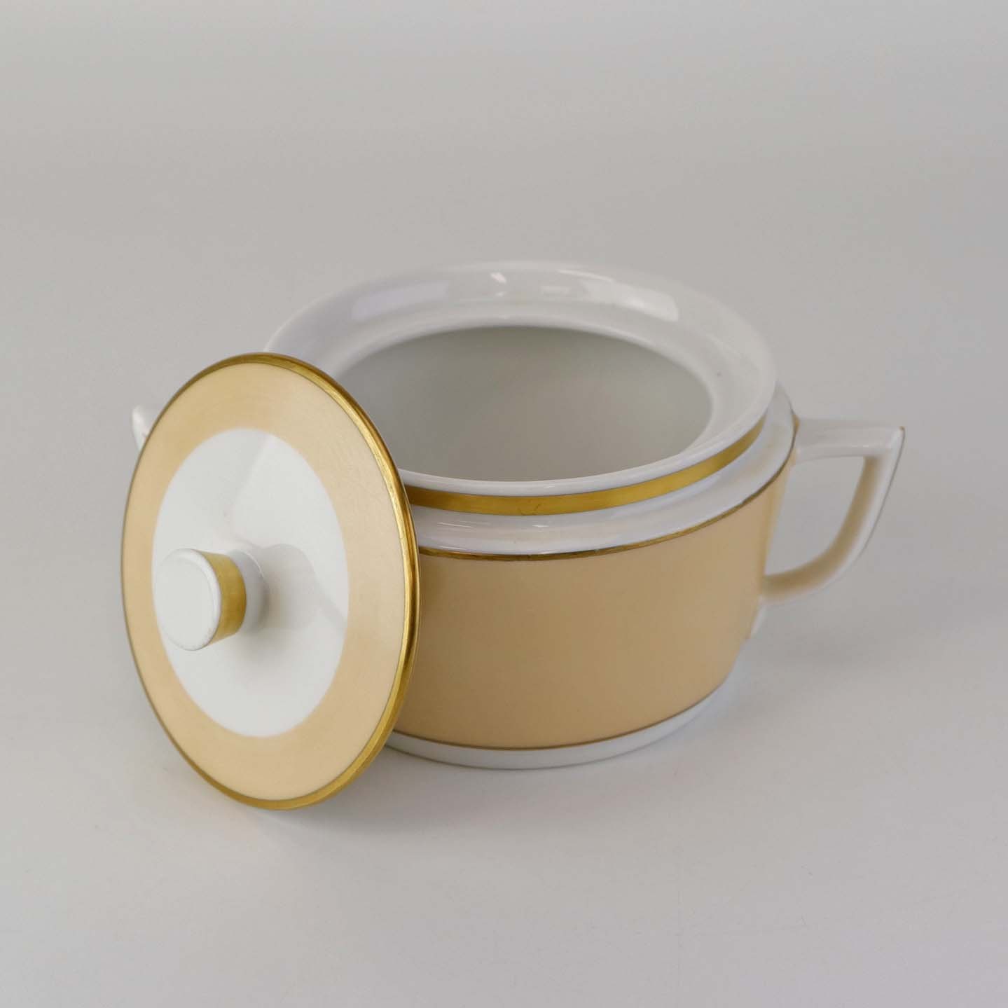 Service i glat hvid porcelæn med sandfarvet dekoration og gylden kant.