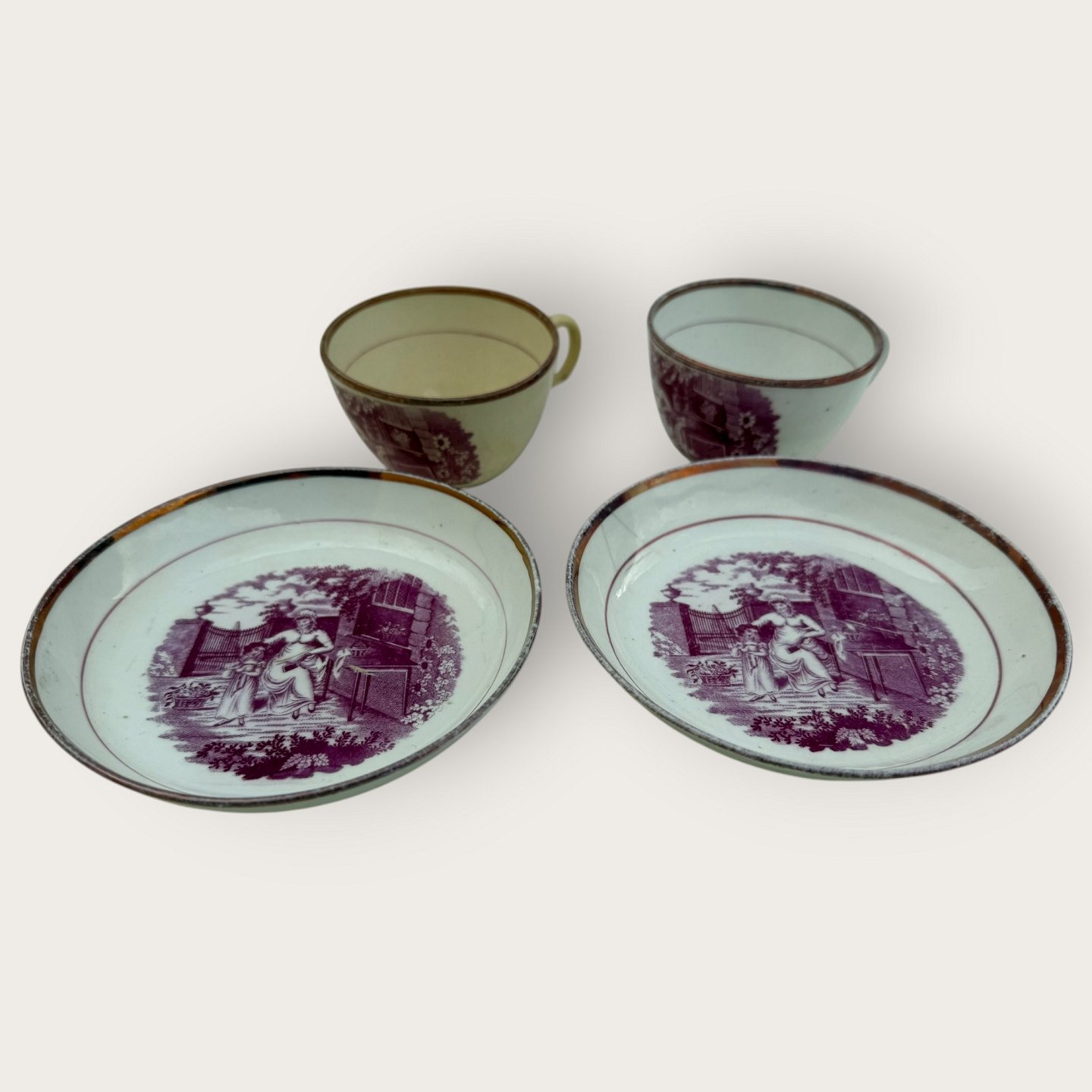 2 antique English porcelain cups with saucers, Staffordshire cups with a motif of mother and child, appear with scratches/age-related minor flaws - see photo.