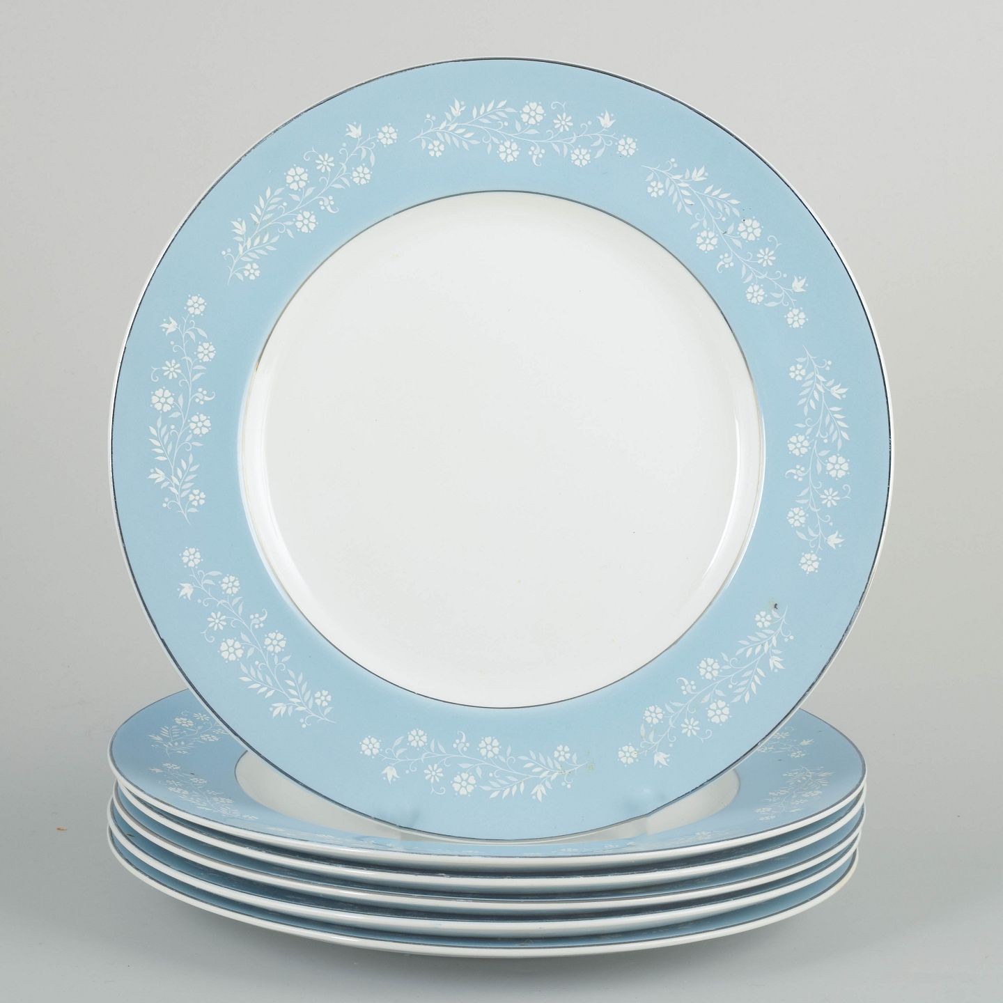 Set of six earthenware dinner plates with a blue border decorated with white flowers and a silver rim.
