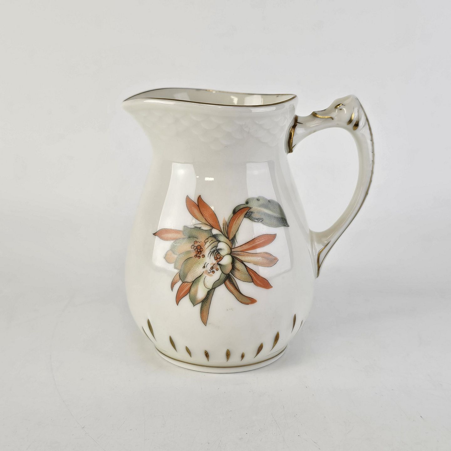 Kaktus er cremefarvet porcelæn i skælform, dekoreret med kaktusblomster og guldkant