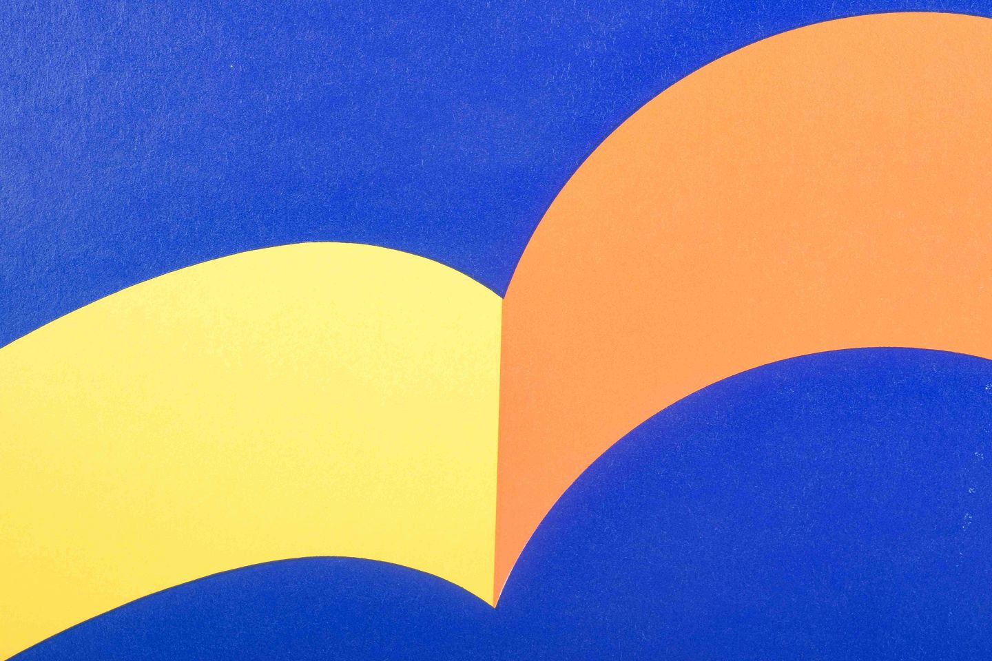 Graphic composition in clear primary colors, where yellow, orange, and red curved forms create a rhythmic contrast against an intense blue background. The work shows Arnoldi’s characteristic minimalist language, focusing on clean lines, strong color fields, and simplicity.