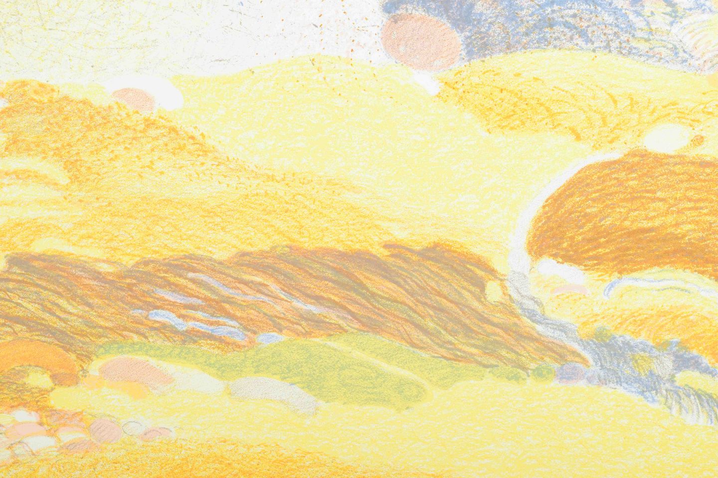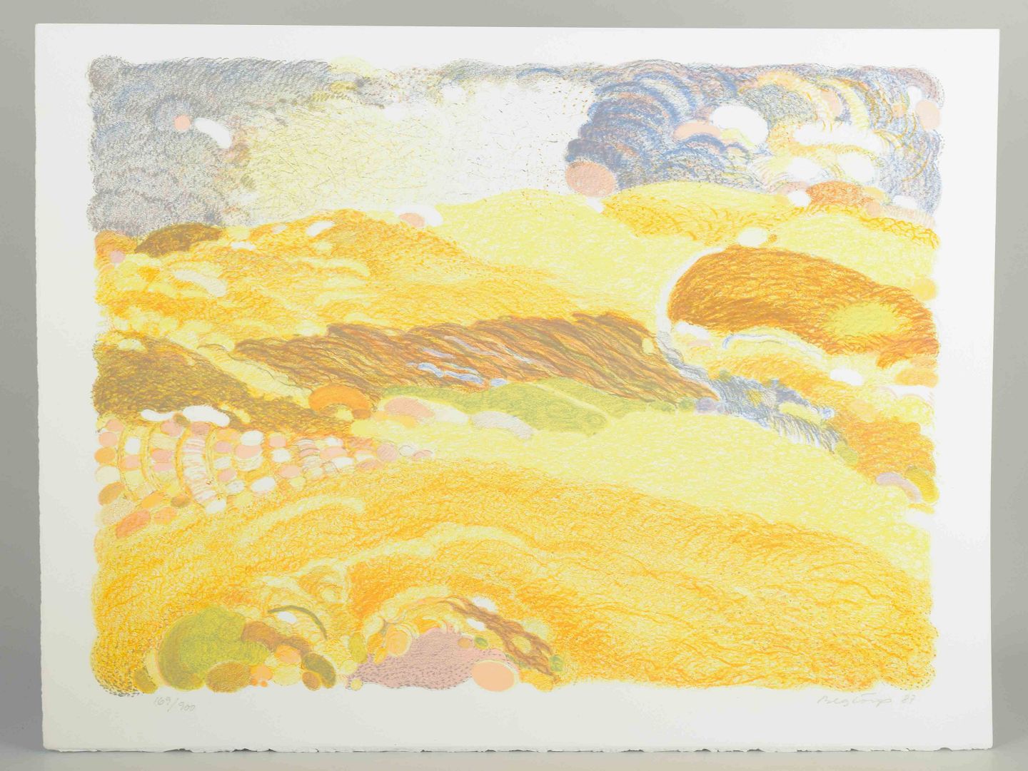 Abstract color lithograph with organic, flowing forms in yellow and golden tones suggesting a lyrical landscape.