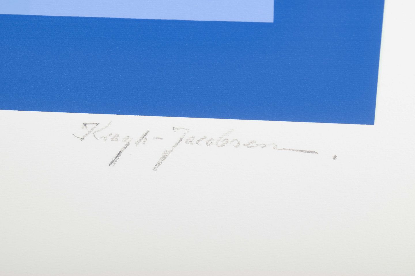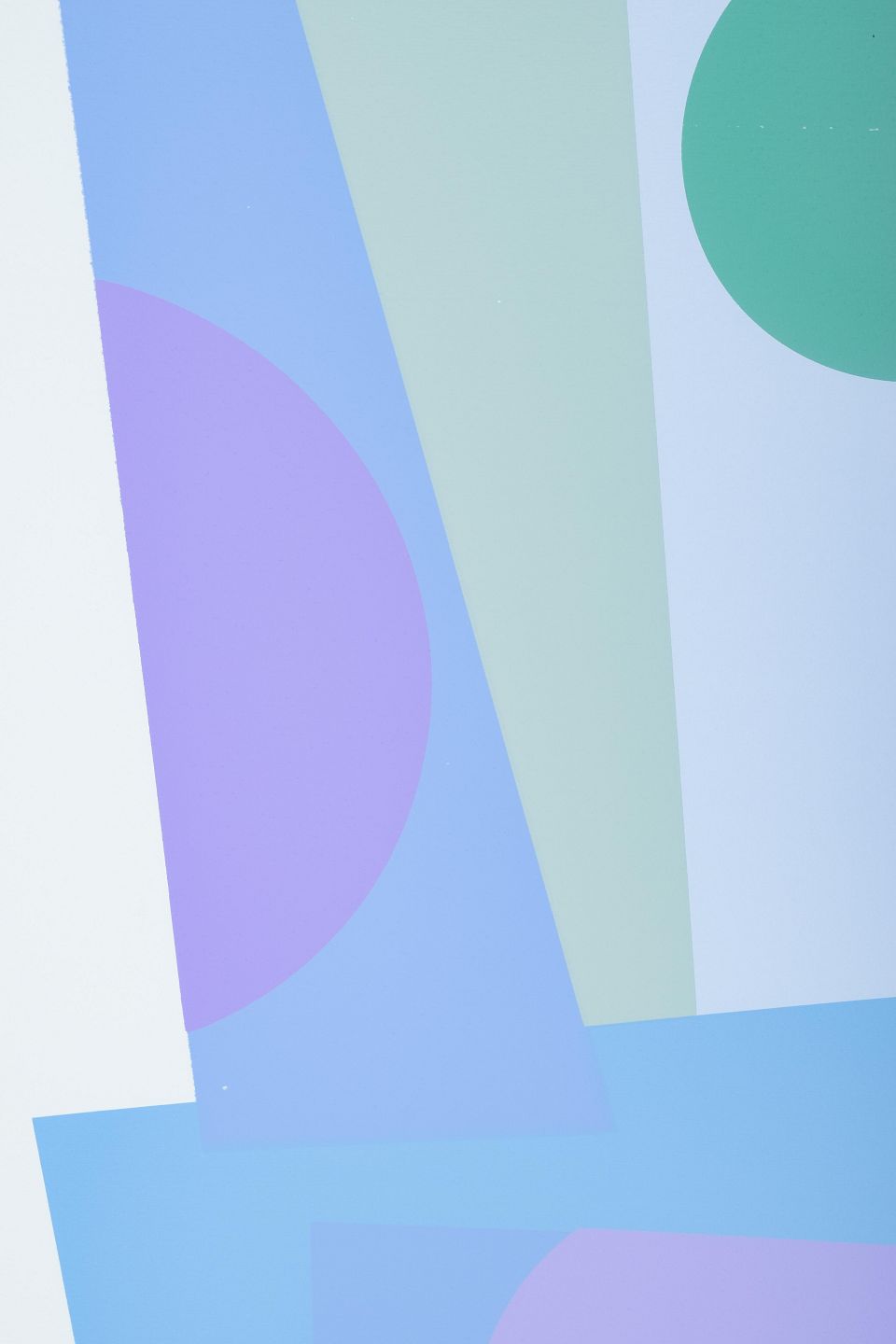 A geometric abstract work in shades of blue and violet, contrasted by green and purple circular forms. The composition is characterized by clear color fields and precisely balanced shapes, highlighting Kragh-Jacobsen’s constructive visual language where color and form are central.