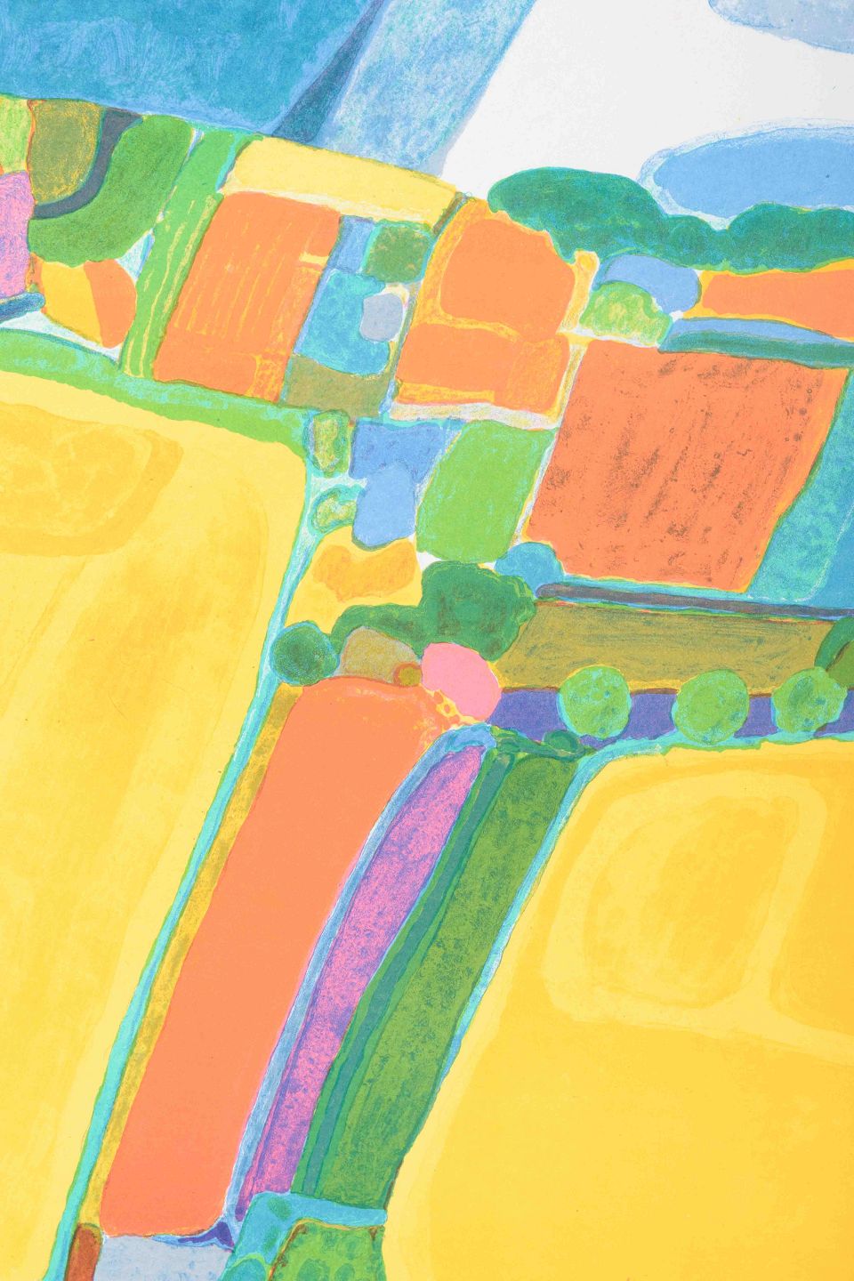 A colorful and stylized landscape motif with geometrically divided fields in yellow, green, and blue tones. The work balances between the decorative and the naturalistic, where colors and forms create an almost abstract pattern with strong rhythm and harmony.