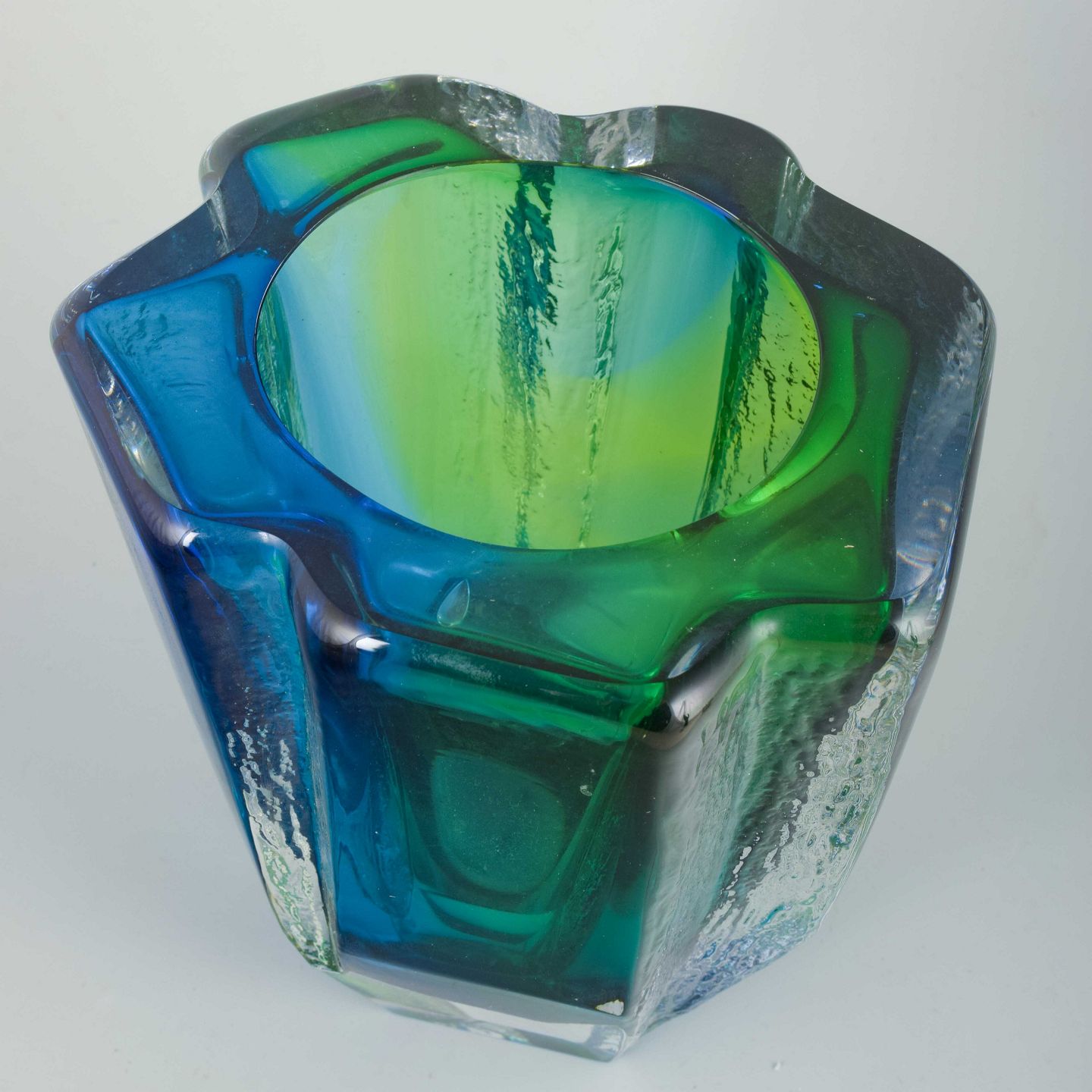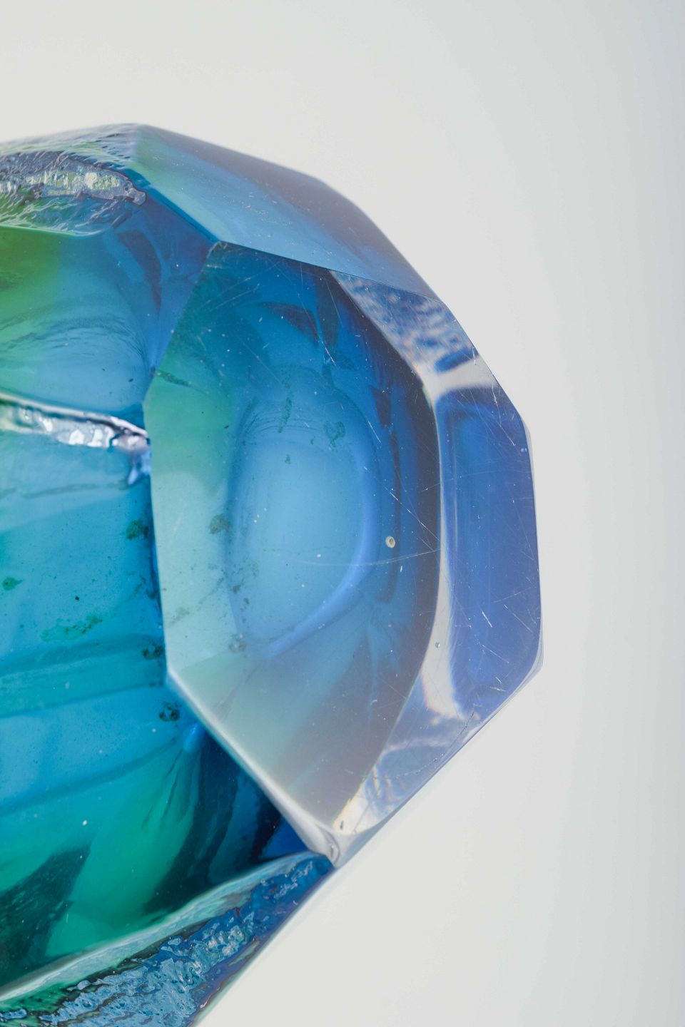 Organic-shaped glass vase in blue and green tones with a solid, sculptural body and faceted design.