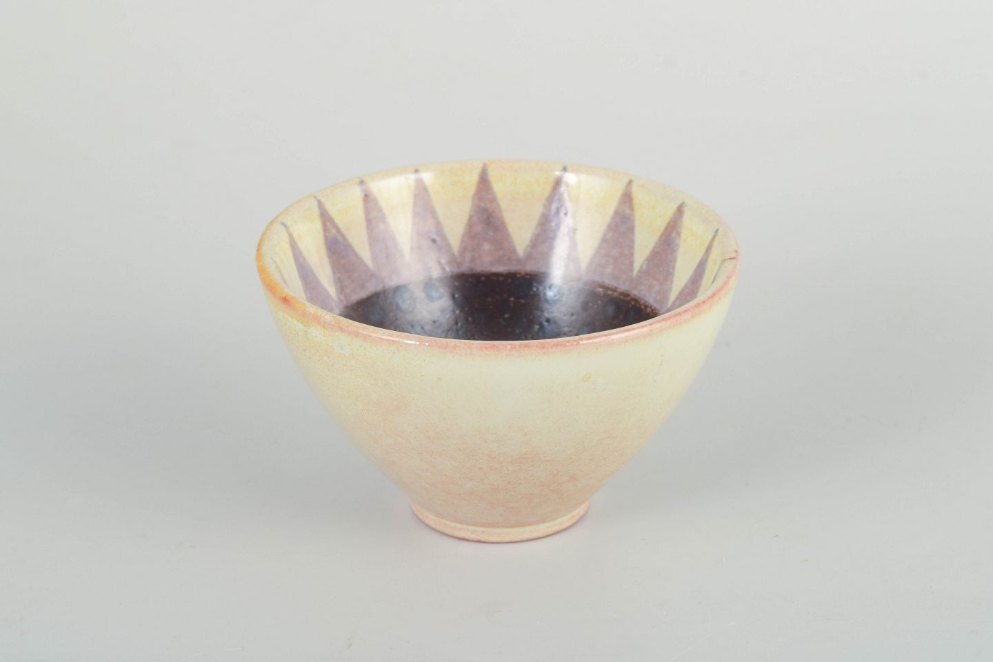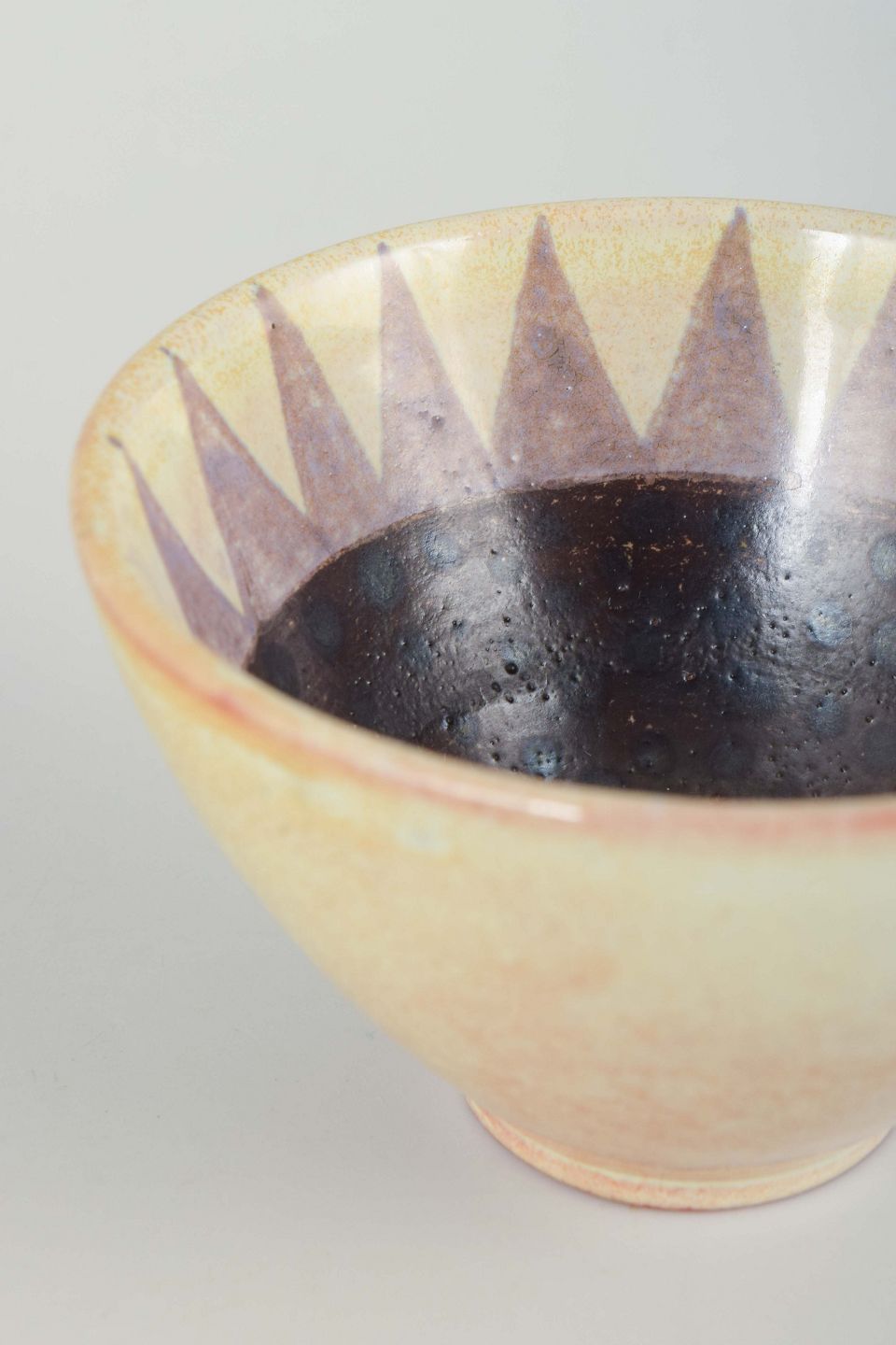 Wheel-thrown stoneware bowl with organic form, outer glaze in pink/white tones and interior decorated with dark glaze and a triangular brown pattern.