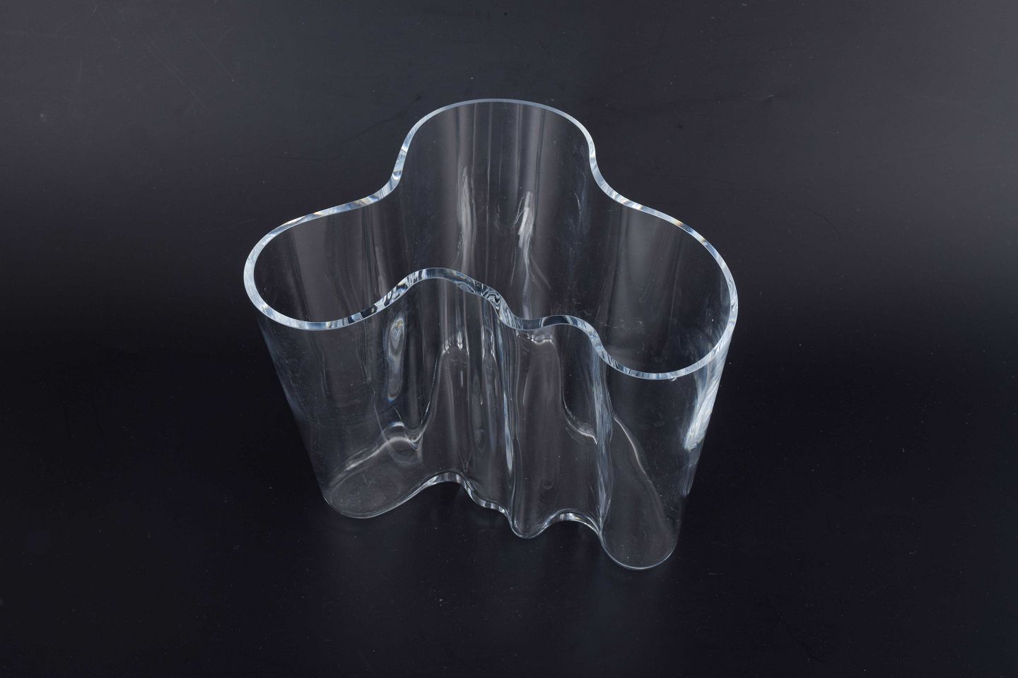 Organically shaped glass vase, known as the Savoy Vase, designed by Alvar Aalto and produced by Iittala. The iconic form with soft, flowing lines is a masterpiece of Scandinavian design history.