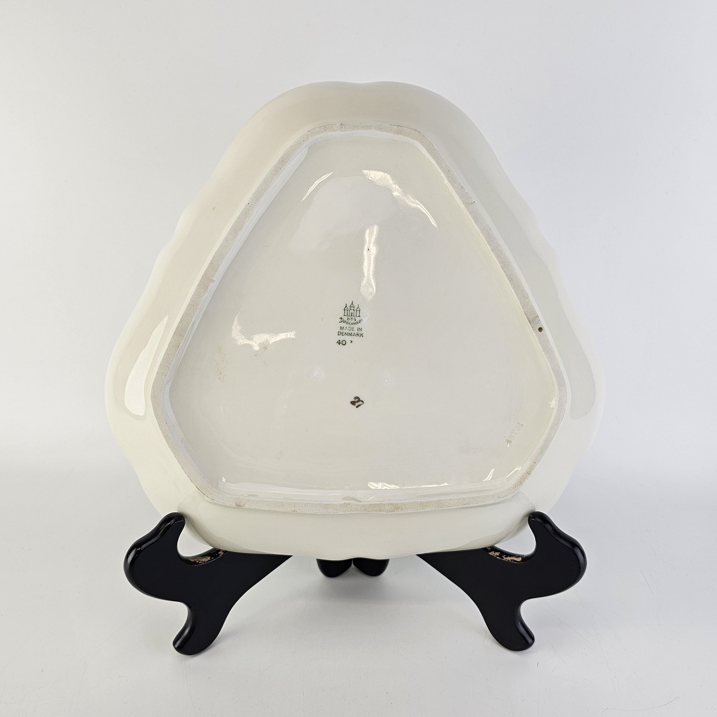 Balder er cremefarvet porcelæn i skælform, dekoreret med hyben og guldkant.