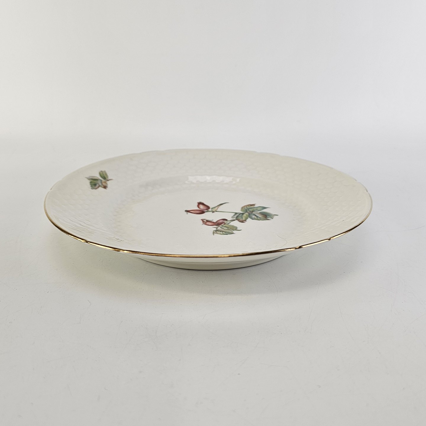 Balder er cremefarvet porcelæn i skælform, dekoreret med hyben og guldkant.