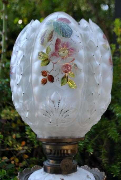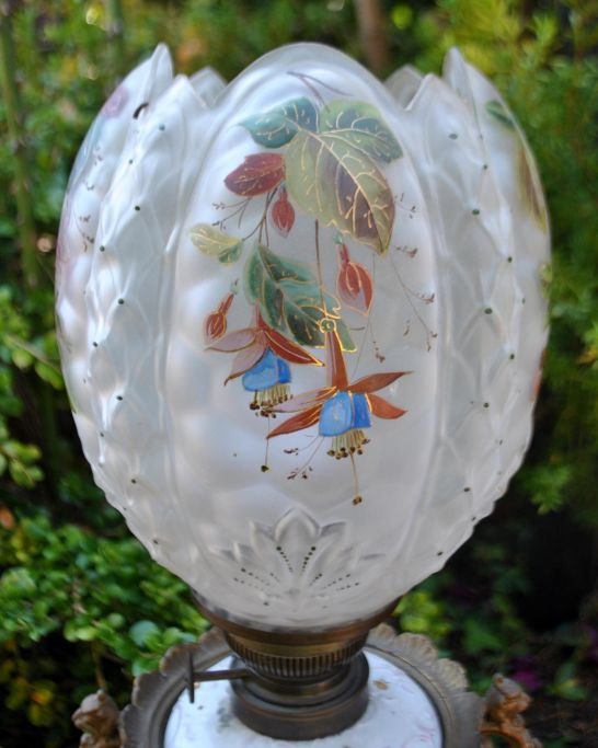 Kerosene lamp in faience and glass, converted to electricity, 19th century. On a gilded base. Faience and glass decorated with painted flowers and gilding. Fire glass included. H incl. fire glass: 62.5 cm. W: 20 cm.