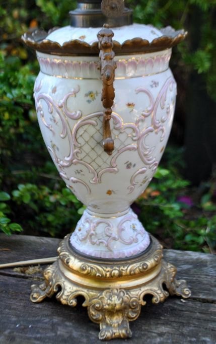 Kerosene lamp in faience and glass, converted to electricity, 19th century.