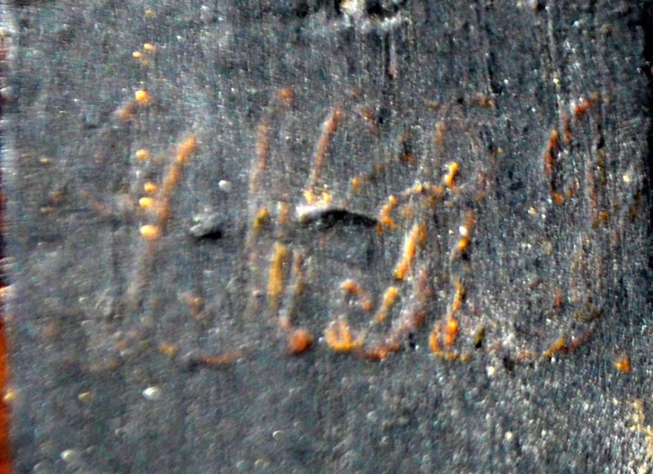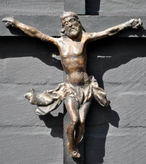 Antique crucifix, 19th century. Christ figure in bronzed pewter. On black-painted wooden cross. 39 x 32 cm.
