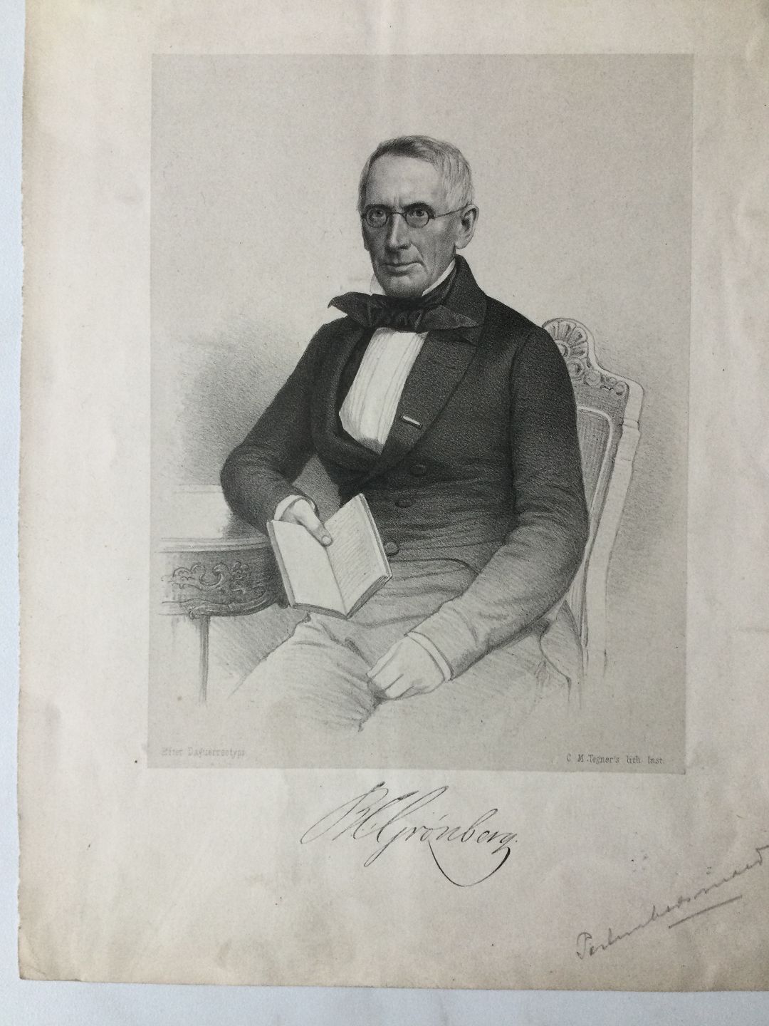 Text available in Danish: Litografi af C.M. Tegner - Portræt af Forfatteren Bendt Christian Grønberg (1791-1864).