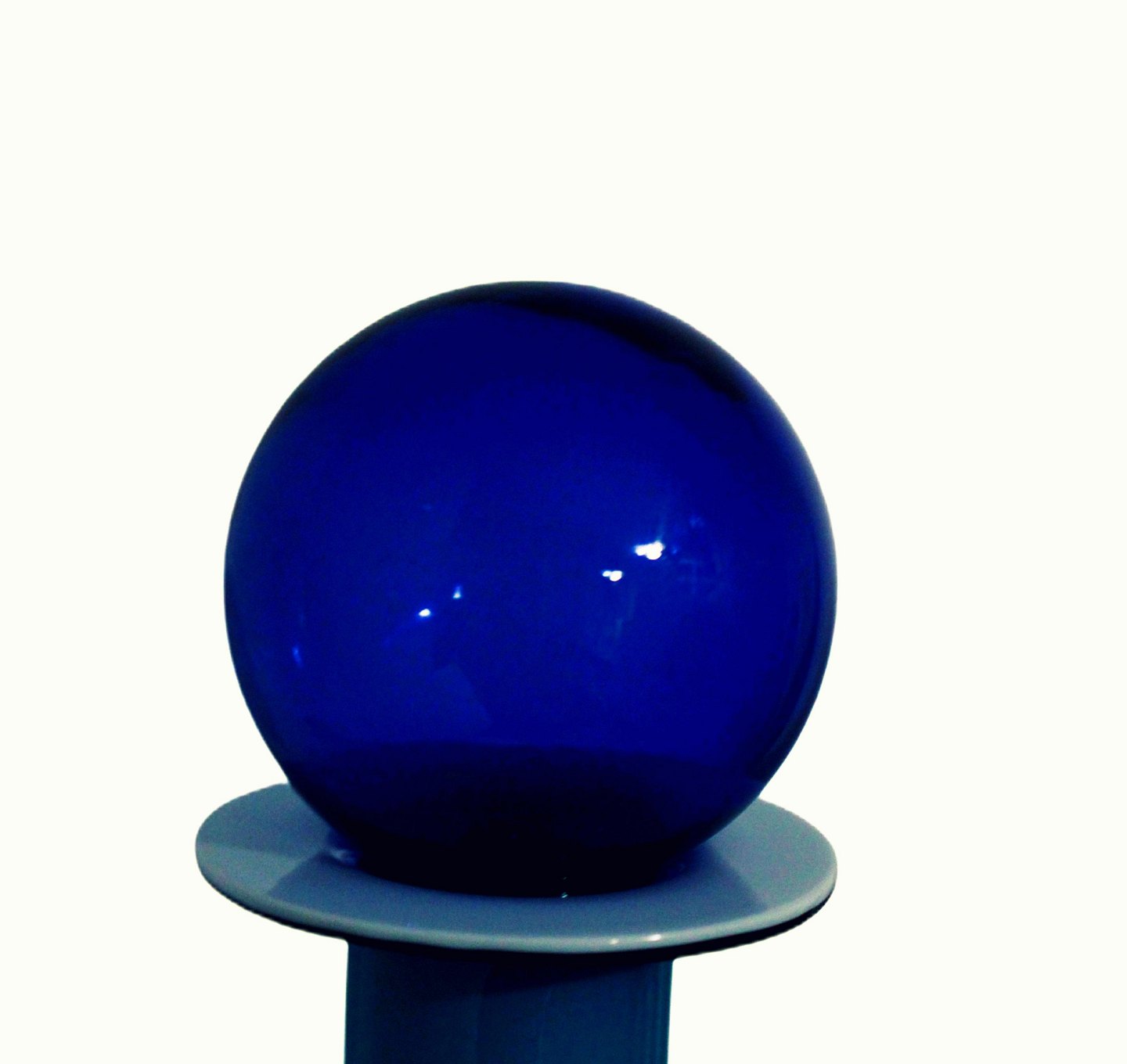 Text available in Danish: Blå pyntekugle i glas, Holmegaard