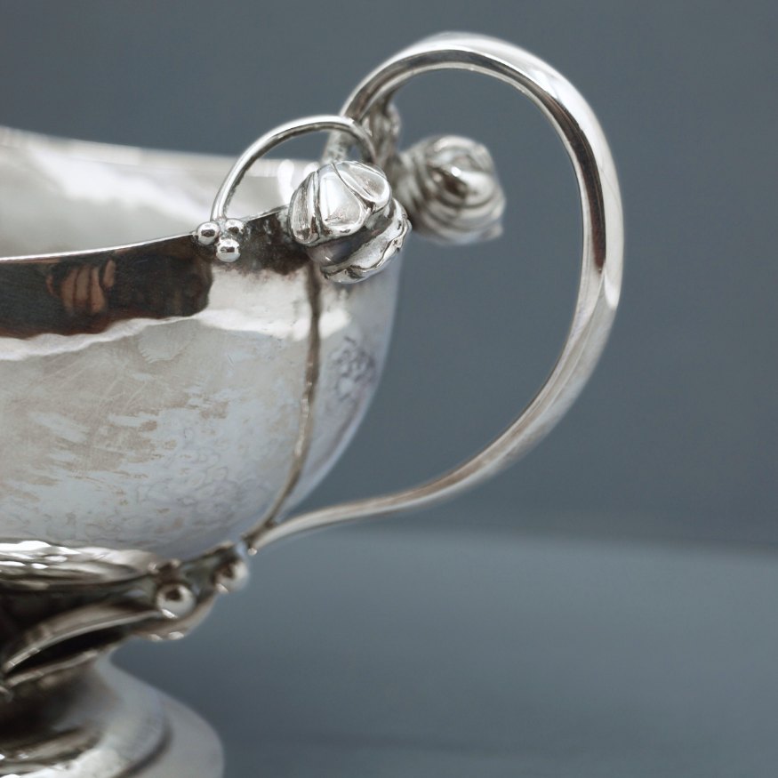 Georg Jensen; A sugar bowl and creamer of hammered sterling silver.