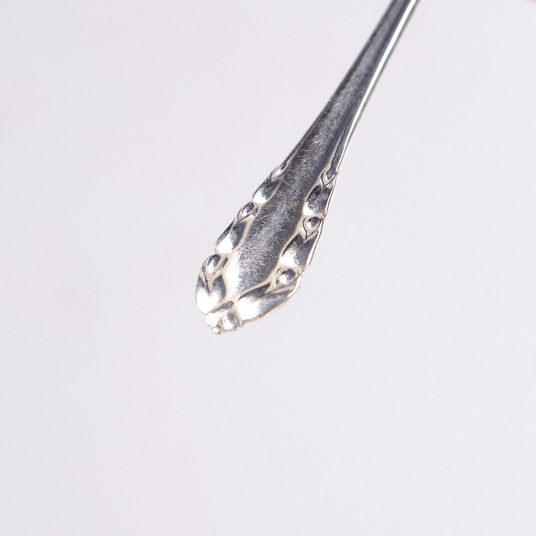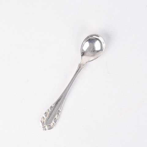 Salt spoon in silver from Georg Jensen, made in the elegant Lily of the Valley pattern. The spoon is stamped and designed with soft lines and natural floral details that characterize Georg Jensen's organic design style.