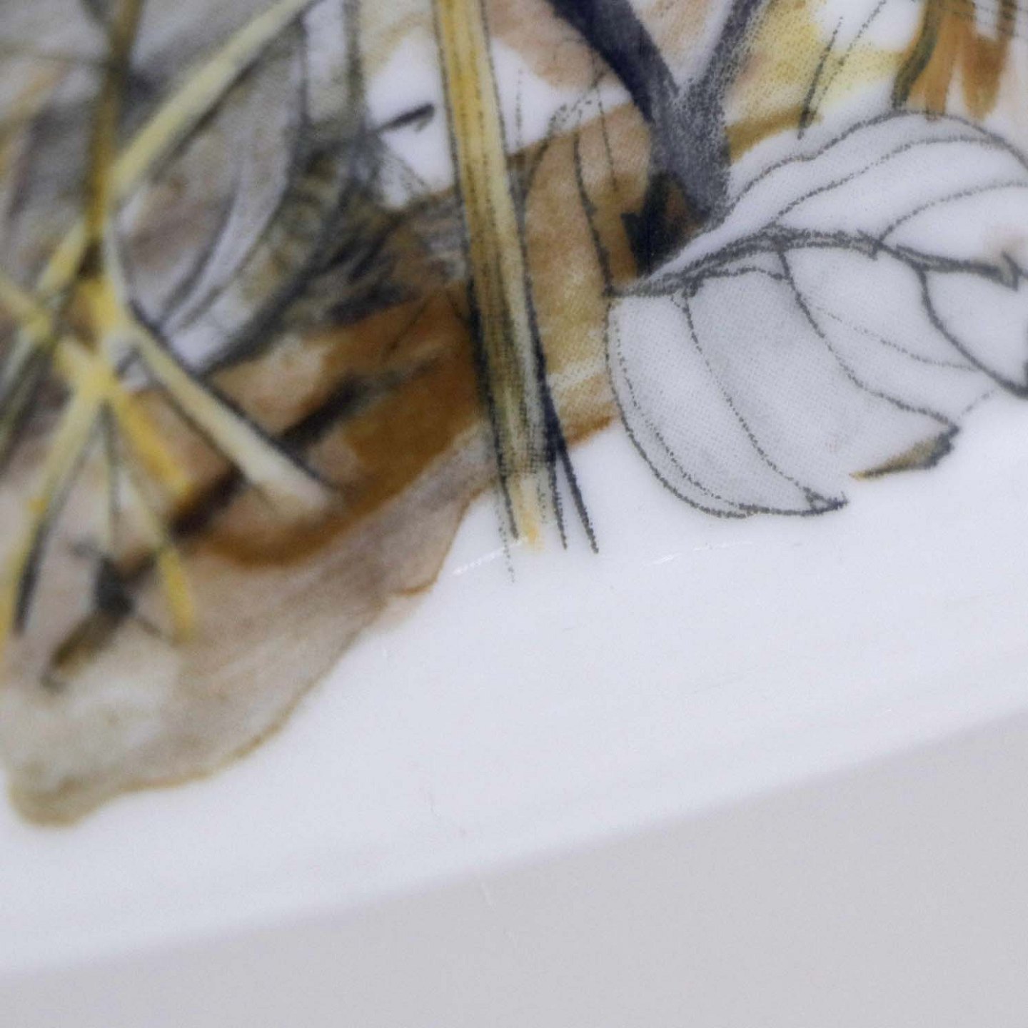 Jagtstellet er i glat hvidt porcelæn med gyldenbrun kantdekoration og motiver af forskellige vilde danske dyr i deres naturlige miljø. Stellet er holdt i dæmpede varme efterårsfarver.