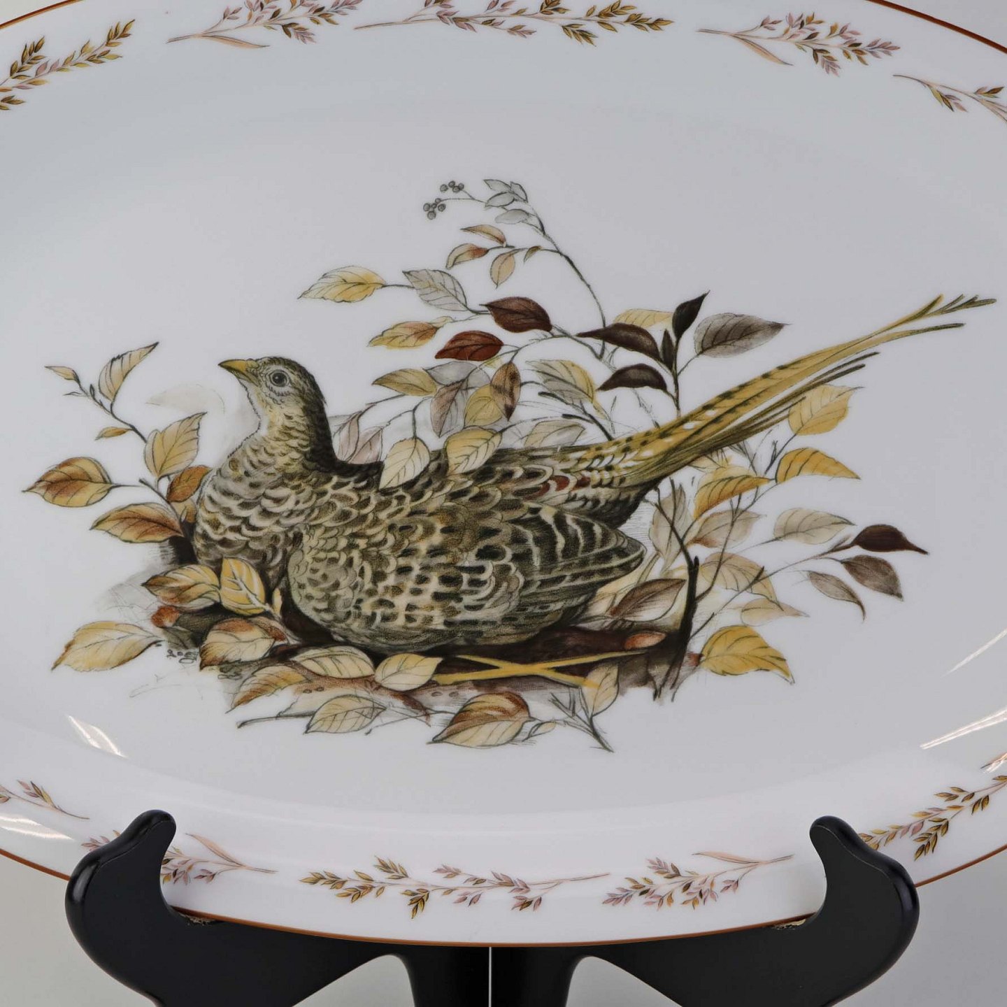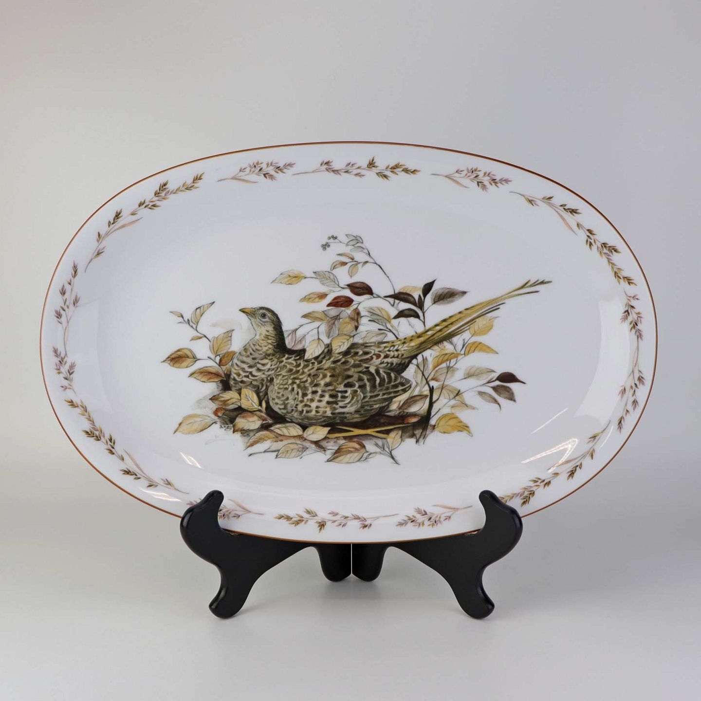 Text available in Danish: Ovalt serveringsfad i porcelæn med motiv af agerhøne på rede fra stellet Jagtstel. Nr. 38