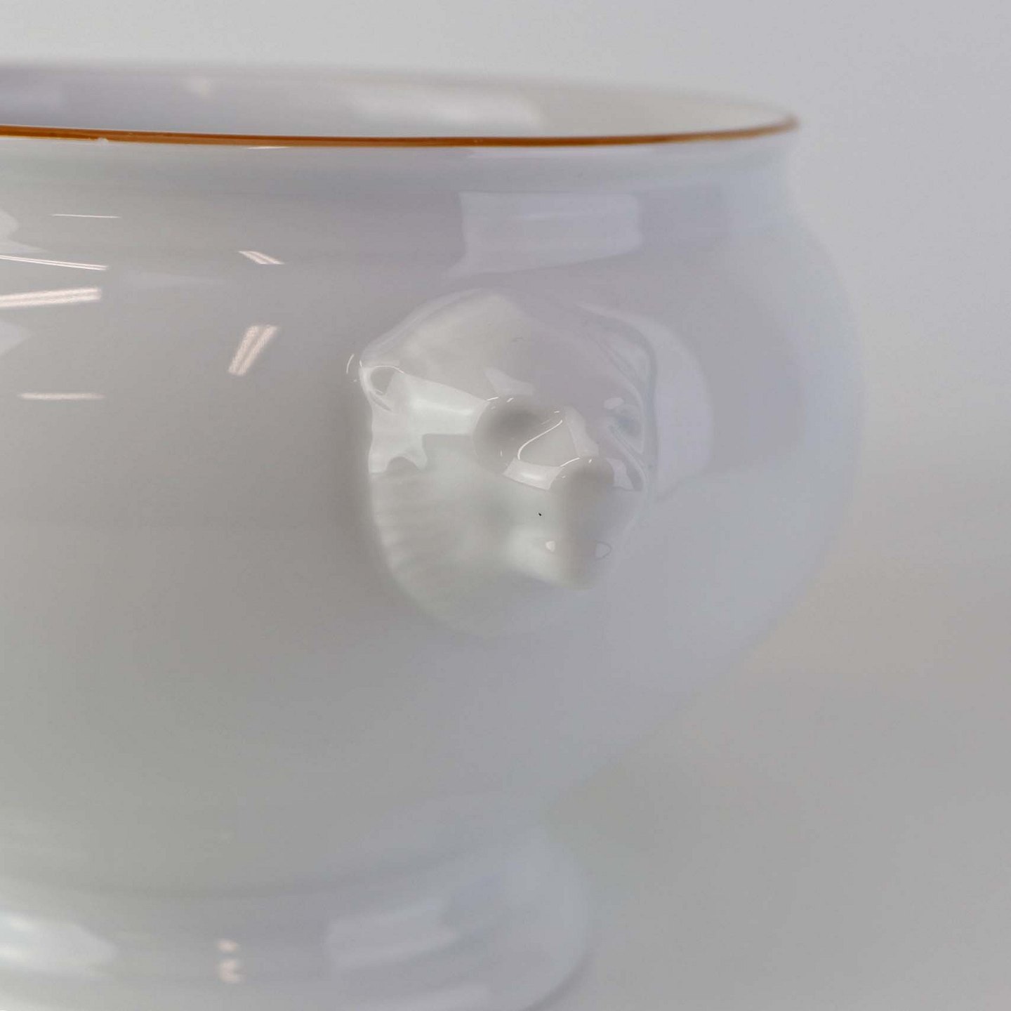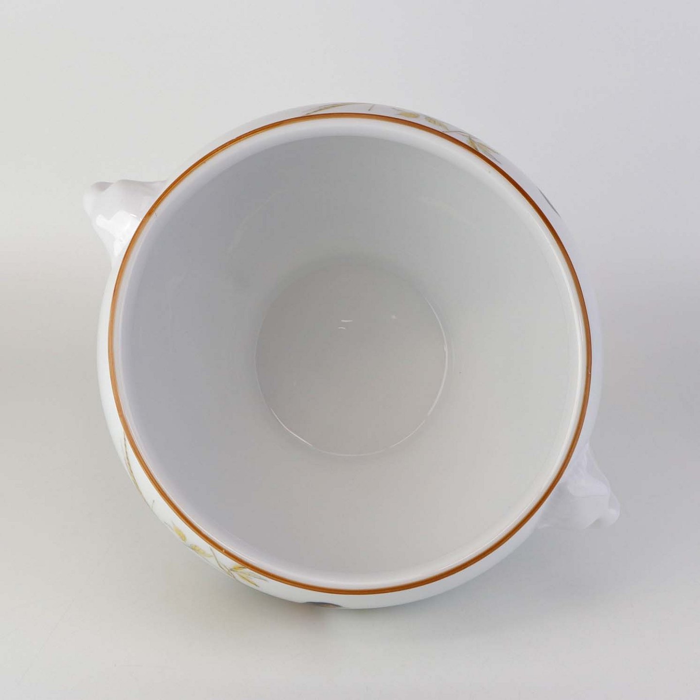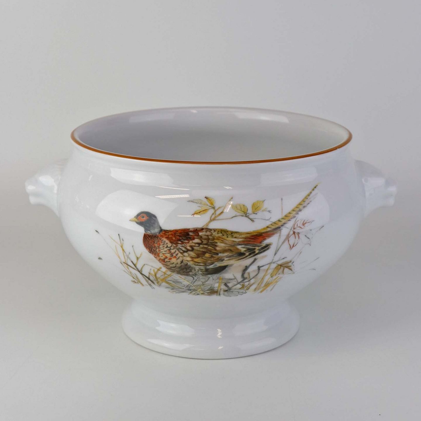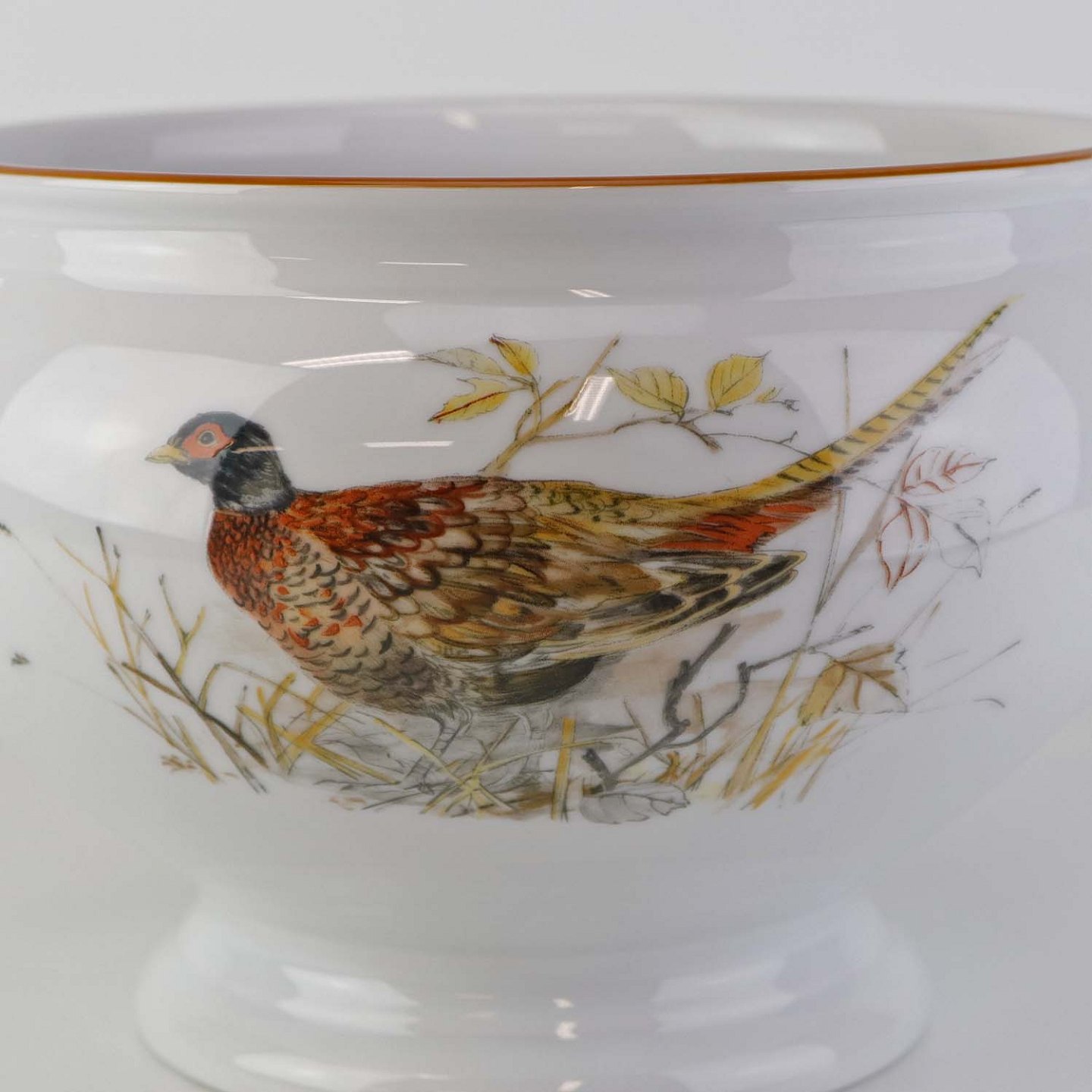 Text available in Danish: Rund skål på fod i porcelæn med hanke af grævlingehoveder og med motiv af fasan fra stellet Jagtstel. Nr. 2